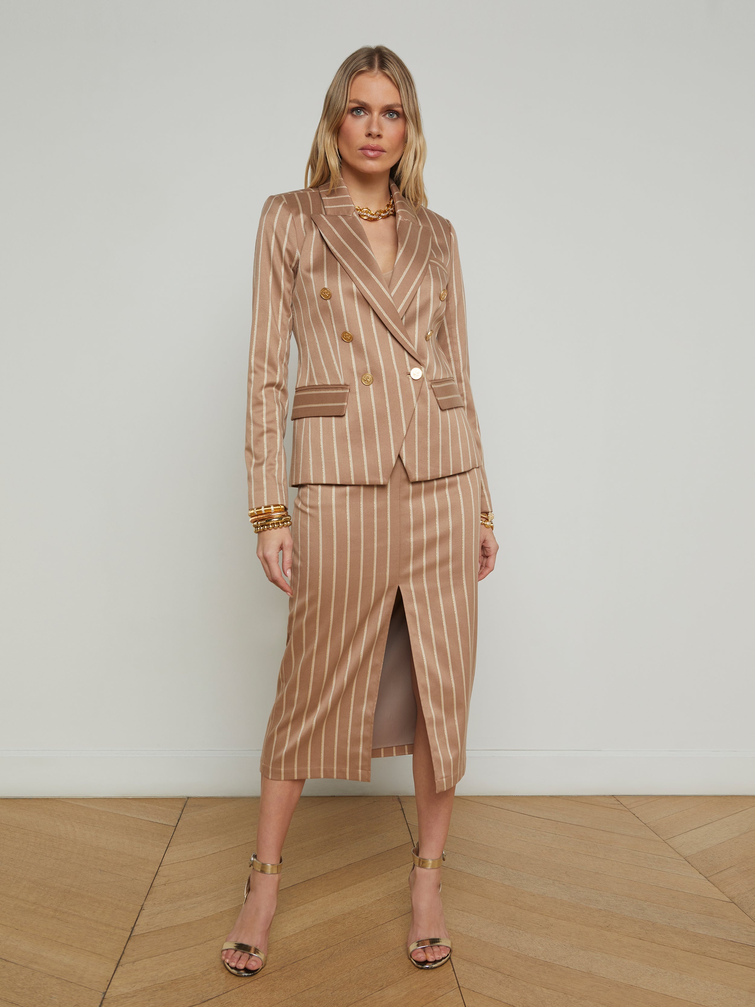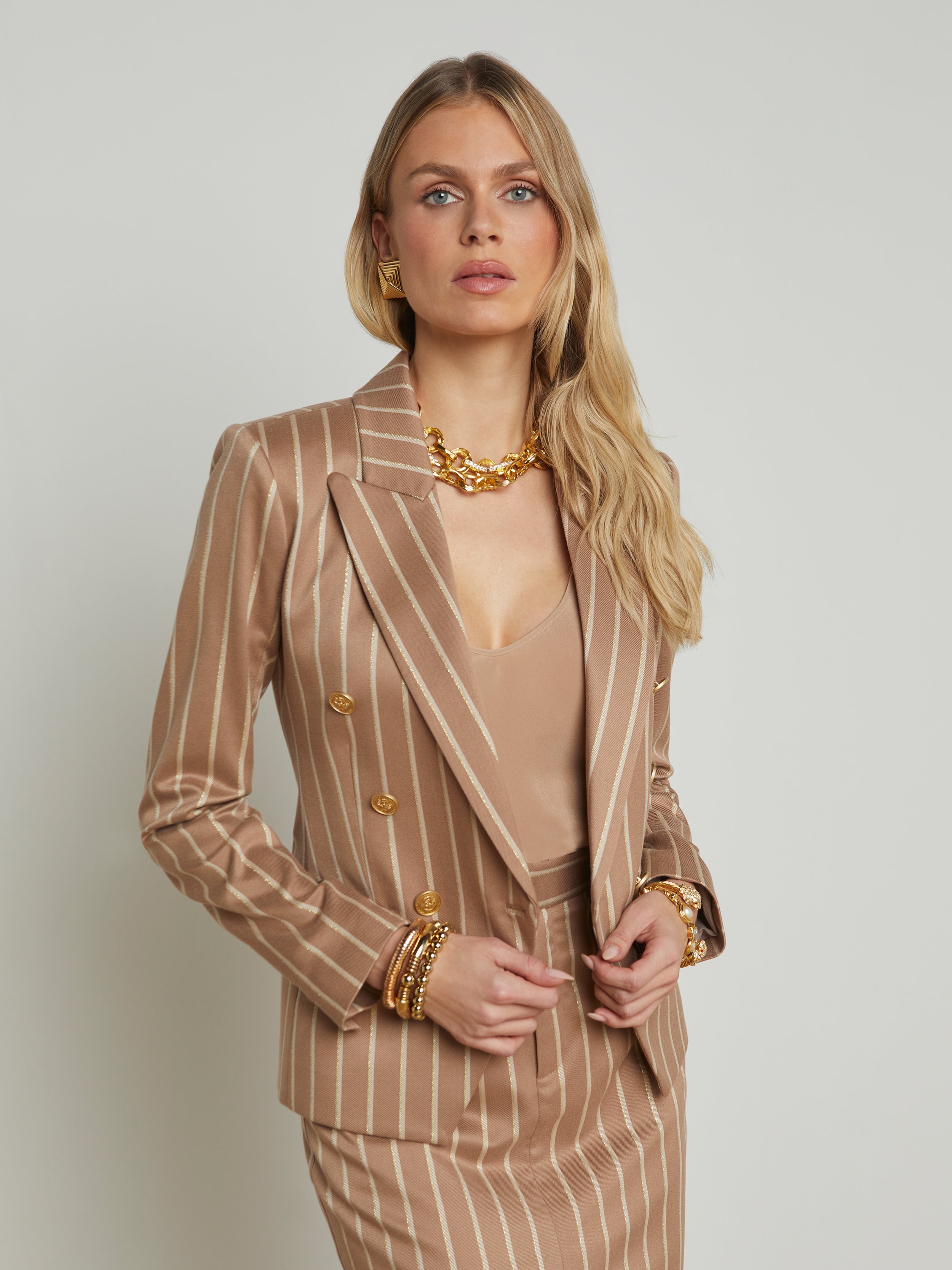 Our super-sculpted Kenzie blazer is a L’AGENCE classic and a bestseller season after season, featuring a tailored slim fit and a slight stretch. Now in a pinstriped chocolate malt with a subtle shimmer. • Striped suiting fabric with threads of lurex • Strong shoulders • Stretch lining • Coin buttons • Flap pockets Style No. 1432ERN2-MMCC DETAILS & FIT - Model Details: Height 5'10.5" | Bust 33" | Waist 24" | Hips 34" | Wearing Size 2 - About 26.25" From Shoulder to Hem - Sleeve Length: 24.3" MATERIALS & CARE Composition - 78% Polyester 18% Rayon 2% Metallic 2% Elastane - Imported Care - Dry clean only