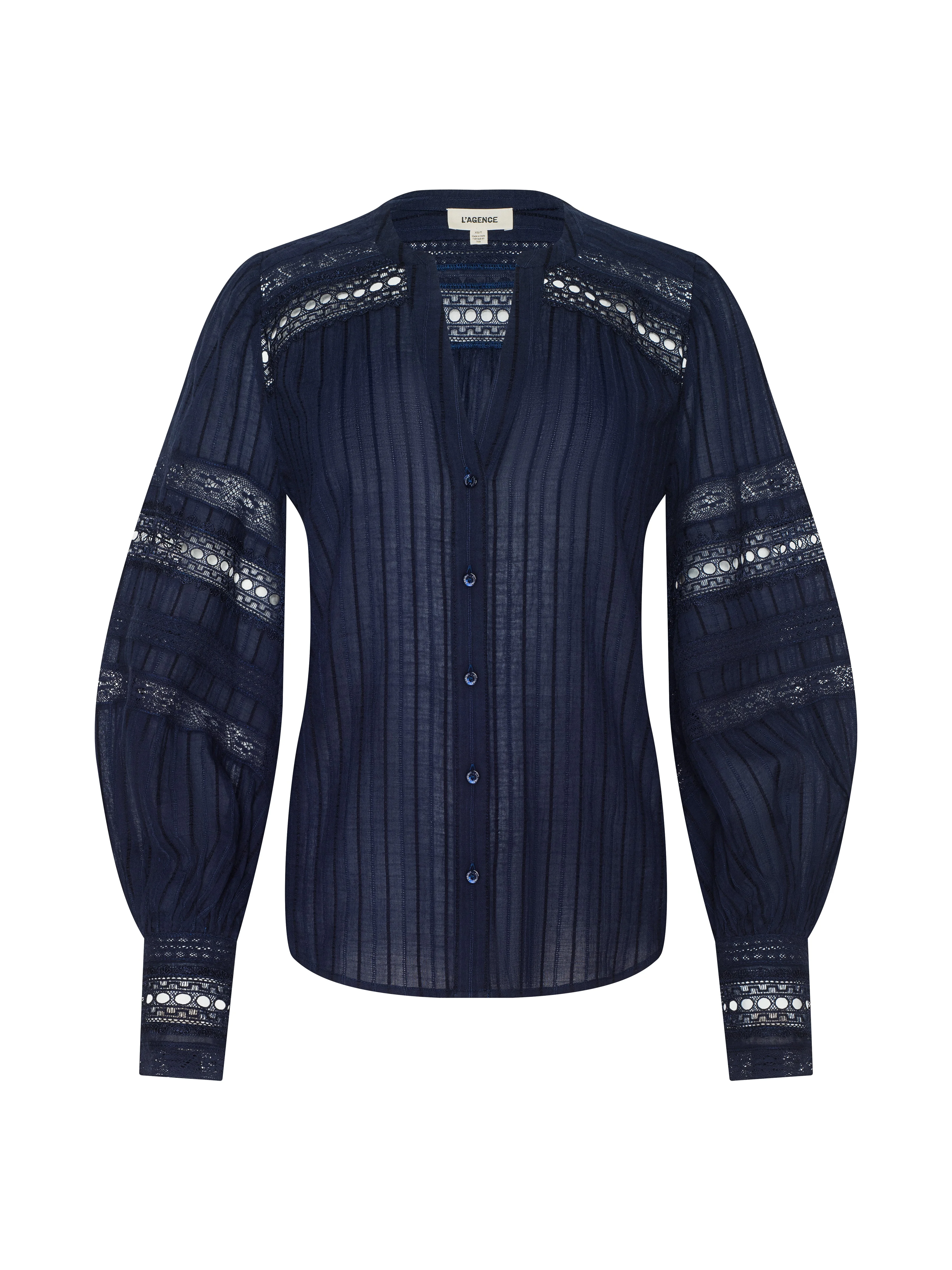 Style No. 40724SAB-NAVY DETAILS & FIT - Model Details: Height 5'9.5" | Bust 32" | Waist 24" | Hips 35" | Wearing Size XS - About 26.2" From Shoulder to Hem - Sleeve Length: 24.2" MATERIALS & CARE Composition - 100% Cotton - Imported Care - Wash with similar color - Dry clean