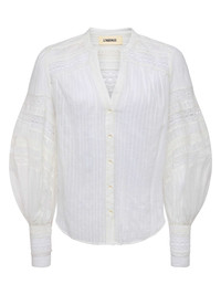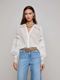 Defined by an airy fit, sultry bohemian undertones, and geometric trim, the Kiera is a blouse for your inner romantic. • Semi sheer cotton-blend jacquard • Geometric trim • Blouson sleeves • Front button closures Style No. 40724SAB-IVOR DETAILS & FIT - Model Details: Height 5'10" | Bust 32" | Waist 23.5" | Hips 34.5"| Wearing Size XS - About 26" From Shoulder to Hem - Sleeve Length: 27.5" MATERIALS & CARE Composition - 100% Cotton - Imported Care - Dry clean only