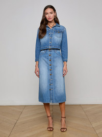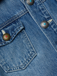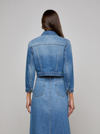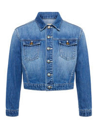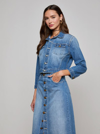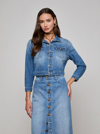 The iconic jean jacket reimagined in a clean cropped cut. Now in a medium wash with highs and lows, finished with novel buttons new to Summer '25. • All-cotton denim • 3/4 sleeves • Flap pockets • Rivet button closure Style No. 1914YRO-WDRW DETAILS & FIT - Model Details: Height 5'10" | Bust 32" | Waist 23.5" | Hips 34.5"| Wearing Size XS - About 18.5" From Shoulder to Hem - Sleeve Length: 20" MATERIALS & CARE Composition - 100% Cotton - Imported Care - Machine wash