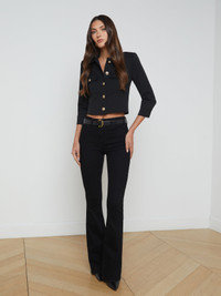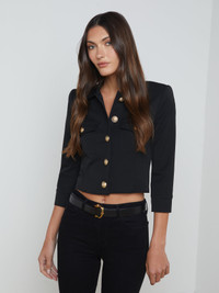 The Kumi is our modern update to the classic three-quarter sleeve jacket. A strong shoulder and tapered silhouette create flattering definition. This versatile black style is crafted from a supple stretch-suiting fabrication and finished with flap pockets and our signature gold embossed dome buttons. Pair with high-waisted denim for a perfectly proportioned look. Style No. 1769NGX-BLAC DETAILS & FIT - Model Details: Height 5’9.5" | Bust 32" | Waist 24" | Hips 35" | Shoe 8 | Wearing Size 2 - About 18.75" From Shoulder to Hem - Sleeve Length: 18.8" MATERIALS & CARE Composition - 68% Polyester 29% Rayon 3% Spandex - Imported Care - Dry clean only - Do not wash - No bleach - No tumble dry - Low iron if needed