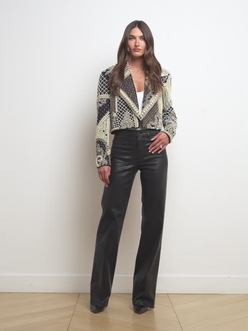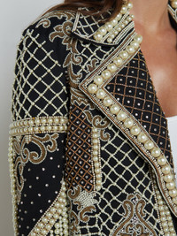 Our Kya jacket is a limited run wearable work of art. Each piece requires 225 hours of artisanal embroidery, five different sizes of faux pearls, and 2,400 crystal embellishments. • 100% cotton • Hand beaded • Fully lined • Cropped, boxy cut • Strong shoulders • Open-front design Please note: this piece will not be restocked. Style No. 1814VTF-BLSV DETAILS & FIT - Model Details: Height 5'10" | Bust 32" | Waist 24'' | Hips 34.5'' | Wearing Size 2 - About 19" From Shoulder to Hem - Sleeve Length: 23.3" MATERIALS & CARE Composition - 100% Cotton - Imported
