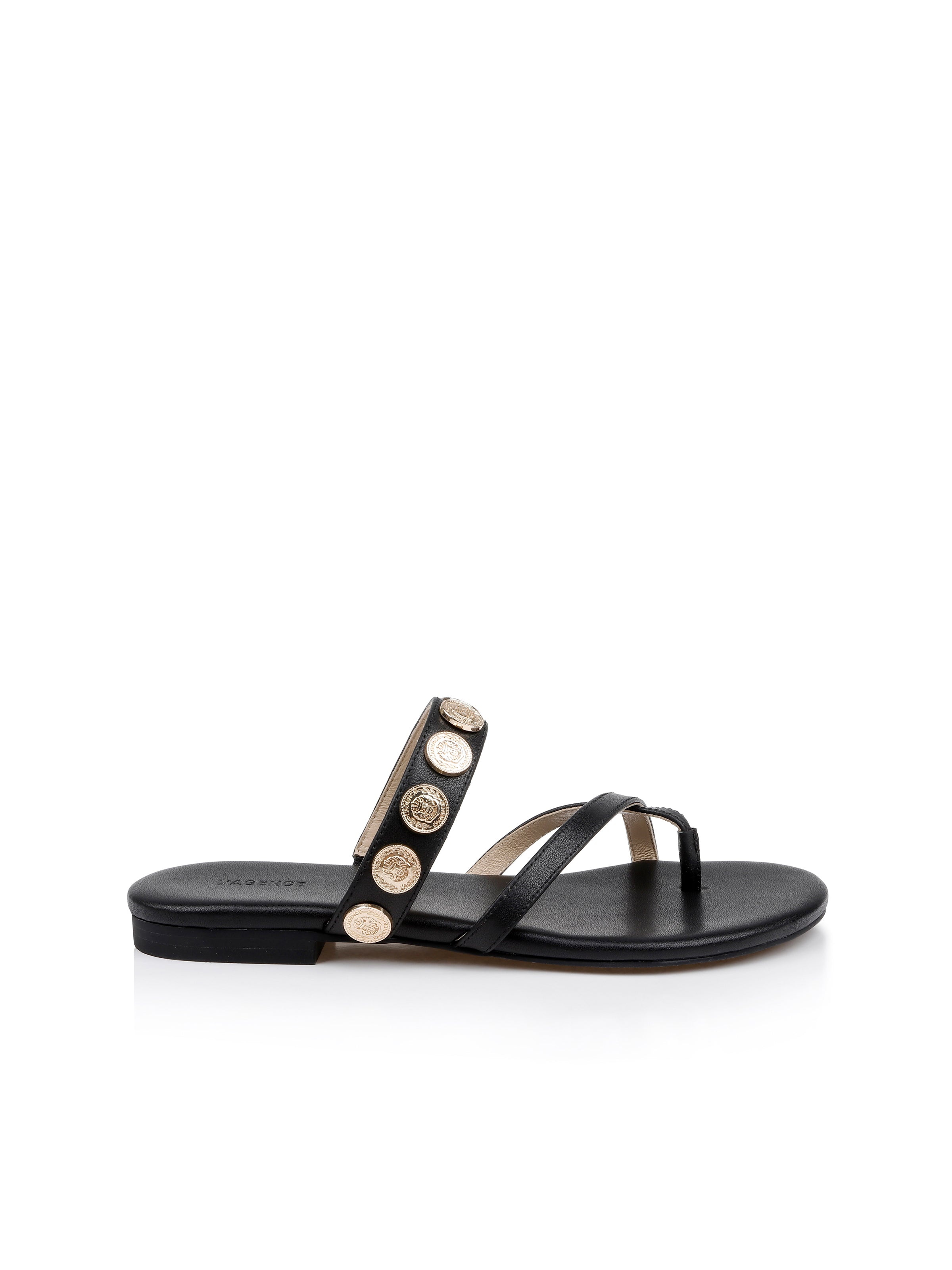 Coin accents add a glamorous touch to this classic flat sandal. • Leather upper & lining • 6mm memory foam cushion • Rubber sole • Round toe Style No. 9TILA1707-BLKL DETAILS & FIT - Heel Height: 0.2" / 5mm MATERIALS & CARE Composition - 100% Calf Leather - Imported
