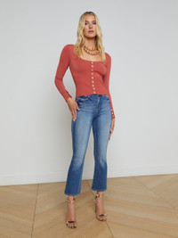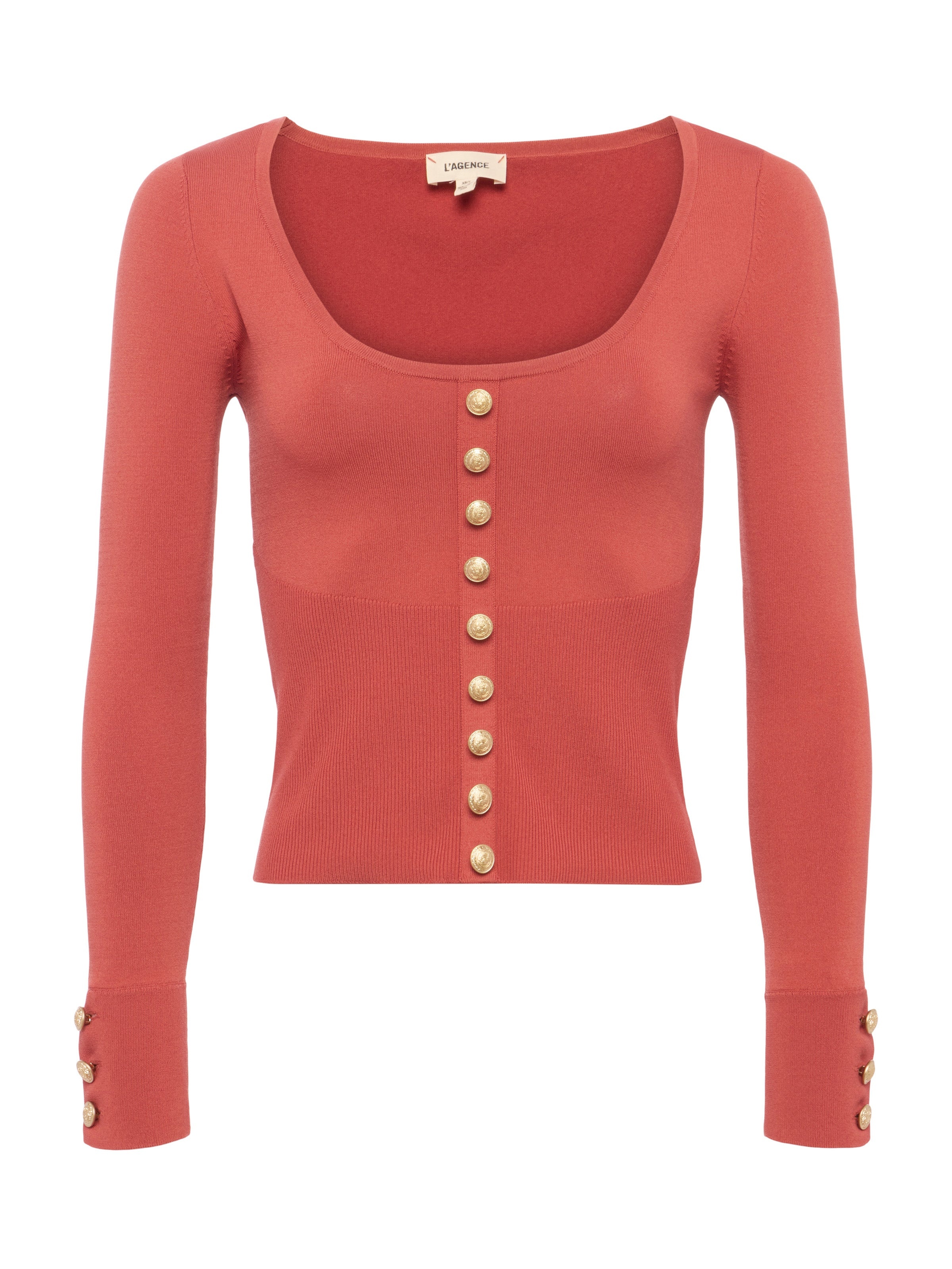 Meet your go-to long sleeve top. Decorative miniature gold buttons and a sultry deep scoop neck transform the Lanetta into an elevated essential. Now in a rich earth tone. • Lightweight power knit • Cropped length • Decorative embossed dome buttons • Faux button placket Style No. 80048NXC2-DUGL DETAILS & FIT - Model Details: Height 5'9" | Bust 32" | Waist 24" | Hips 34" | Wearing Size XS - About 19" From Shoulder to Hem - Sleeve Length: 21.75" MATERIALS & CARE Composition - 55% Rayon 43% Nylon 2% Spandex - Imported