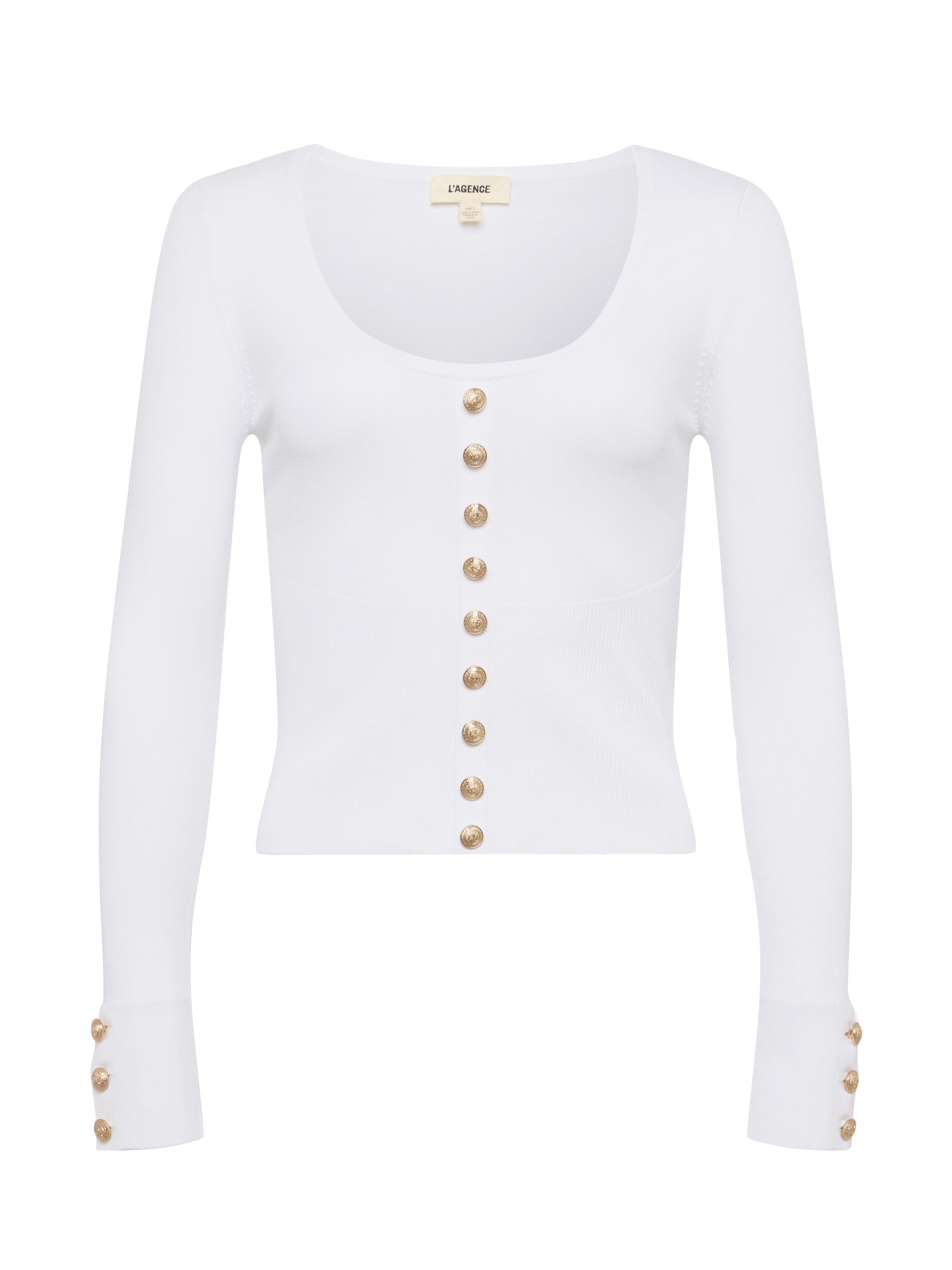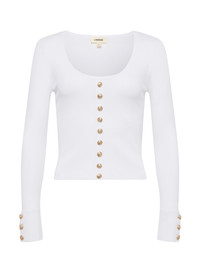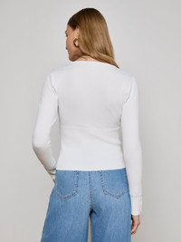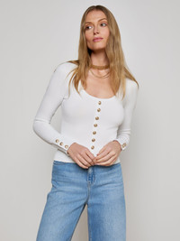 Meet your go-to long sleeve top. Decorative miniature gold buttons and a sultry deep scoop neck transform the Lanetta into an elevated essential. Now in timeless white. • Power knit • Cropped length • Decorative embossed dome buttons • Faux button placket Style No. 80048NXC2-WHGD DETAILS & FIT - Model Details: Height 5'8" | Bust 32" | Waist 24.5" | Hips 34" | Wearing Size XS - About 19" From Shoulder to Hem - Sleeve Length: 21.75" MATERIALS & CARE Composition - 55% Rayon 43% Nylon 2% Spandex - Imported Care - Dry clean only