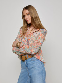 The Laurent is our relaxed fit long sleeve button-down, now in a paisley print with sun-washed tones. • Poly chiffon • Relaxed fit • Button closure Style No. 40363TQE-OBTP DETAILS & FIT - Model Details: Height 5'8" | Bust 32" | Waist 24.5" | Hips 34" | Wearing Size XS - About 26.4" From Shoulder to Hem - Sleeve Length: 23.8" MATERIALS & CARE Composition - 100% Polyester - Imported