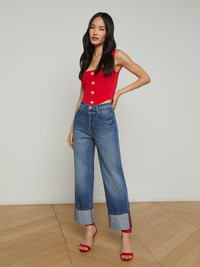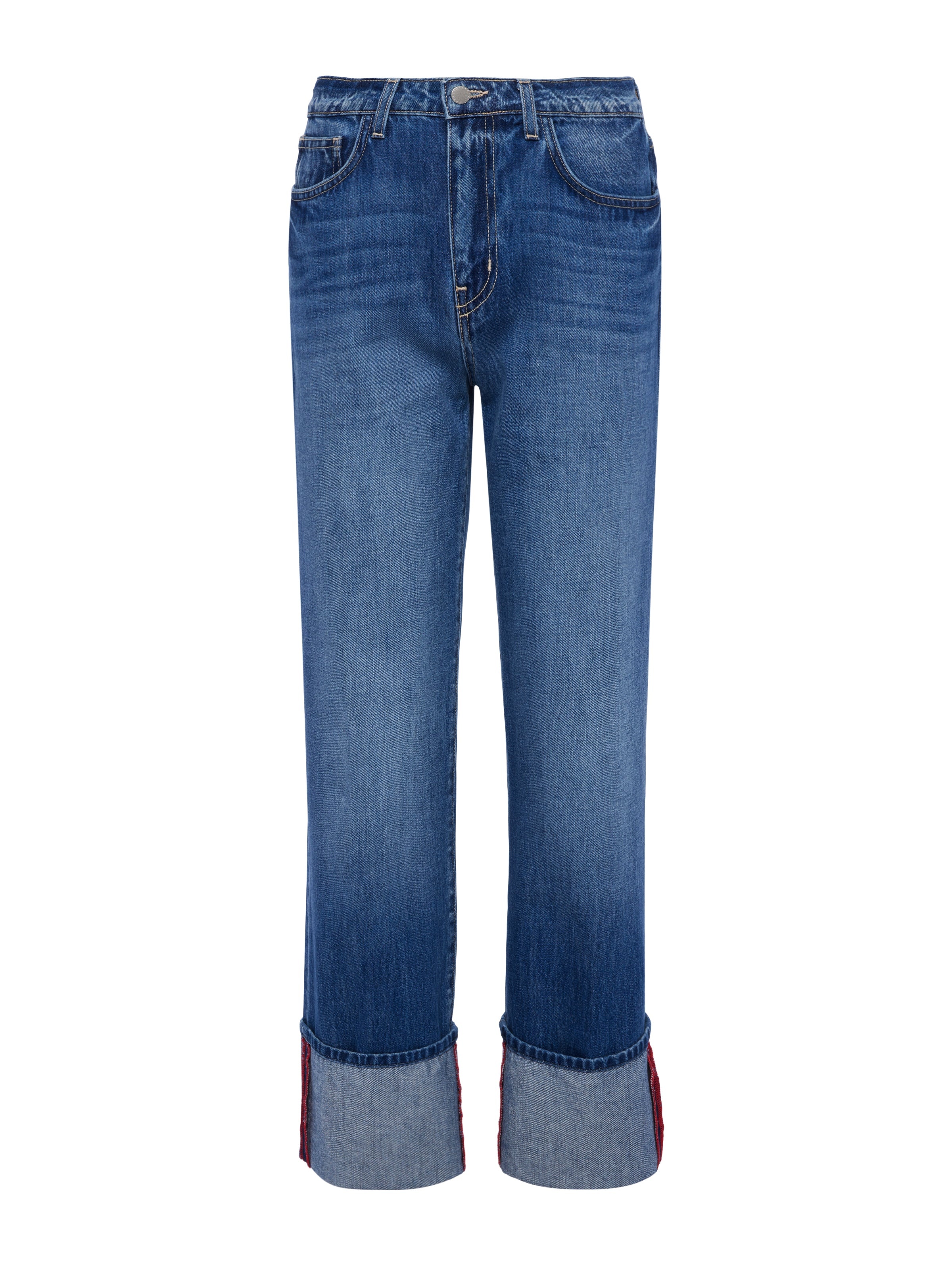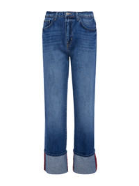 A vintage feel meets a modern cut in the cropped Leighton jean. A cuffed hem and contrast topstitching add personality to this relaxed straight-leg, now in an aged indigo wash. • Premium all-cotton denim • High rise straight leg • 5-pocket design • Zip fly and button closure • 26” inseam Style No. 2915YRO-BREN DETAILS & FIT - Model Details: Height 5'9" | Bust 30" | Waist 24" | Hips 34" | Wearing Size 25 - Rise: 10.5" - Inseam: 26" - Leg Opening: 15.5" MATERIALS & CARE Composition - 100% Cotton - Made in Los Angeles Care - Machine wash