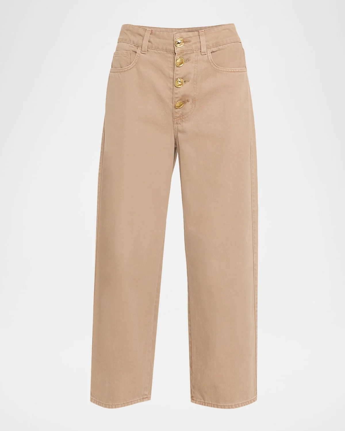 - L'Agence "Liora" jeans in colored denim - Approx. 11" rise; 25.5 " inseam - High rise - Five-pocket style - Wide legs - Cropped length - Exposed button-fly; belt loops - Cotton - Machine wash cold - Made in USA