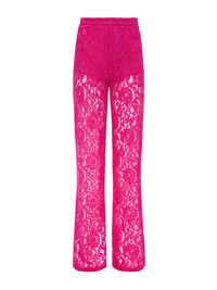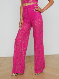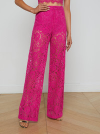 The L’AGENCE favorite straight-leg trouser, fitted through the hips and relaxed through the leg. Now in a hot pink structured floral lace. • Corded lace • Partially lined • High-rise straight leg • Hook and bar closure Style No. 2911ACK-LTRB DETAILS & FIT - Model Details: Height 5'9" | Bust 32" | Waist 24" | Hips 34" | Wearing Size 2 - Rise: 11" - Inseam: 34" - Leg Opening: 11.25" MATERIALS & CARE Composition - 75% Nylon 25% Cotton - Imported