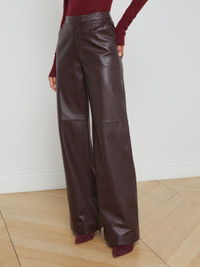 The L’AGENCE favorite straight-leg trouser, fitted through the hips and relaxed through the leg. Reinvented each season in fresh prints and fabrications. • 100% lambskin leather • High-rise wide straight-leg • Side slant pockets • Back welt pockets • Hidden hook-and-bar closure Style No. 2819MLL2-DKSY DETAILS & FIT - Model Details: Height 5'10" | Bust 32" | Waist 24'' | Hips 34.5'' | Wearing Size 2 - Rise: 10.8" - Inseam: 34" - Leg Opening: 11.4" MATERIALS & CARE Composition - 100% Lambskin - Imported Care - Dry clean only with leather professional - Do not wash - Do not use bleach - Do not tumble dry - Do not iron - Color transfer or crocking may occur and is especially common with dyed leather