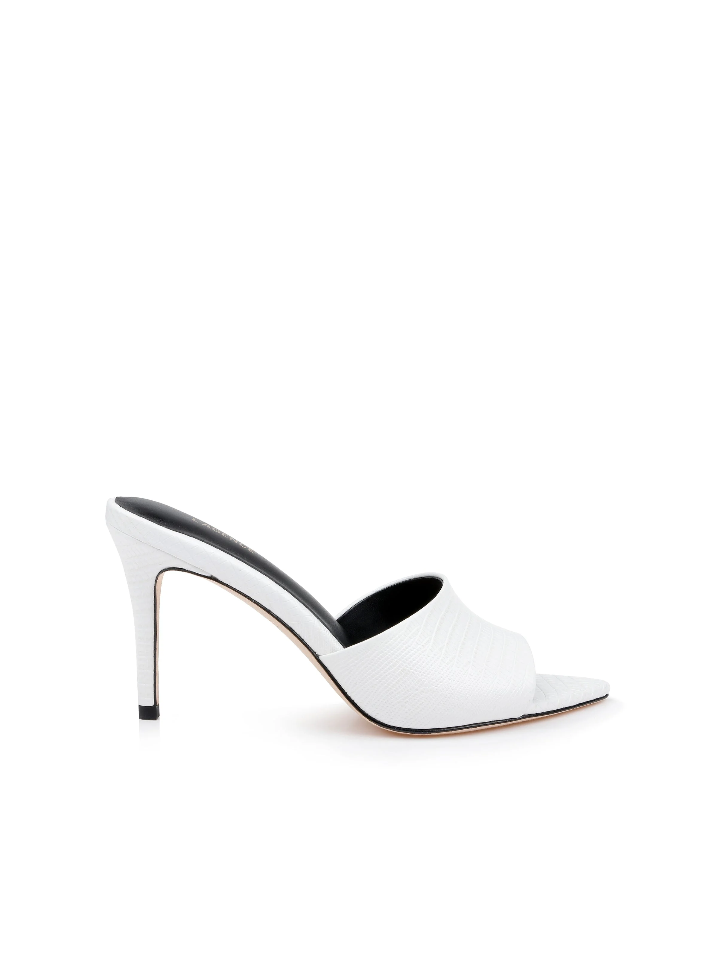 Our signature peep-toe mule, updated in lizard embossed white leather for an edgy spin on minimalist style. • 100% kid leather • Leather lining & sole • 6mm memory foam insole • Pointed toe • Slim heel Style No. 9TILA1002G-ILIL DETAILS & FIT - Heel Height: 3.35" / 85mm MATERIALS & CARE Composition - 100% Calf Leather - Imported