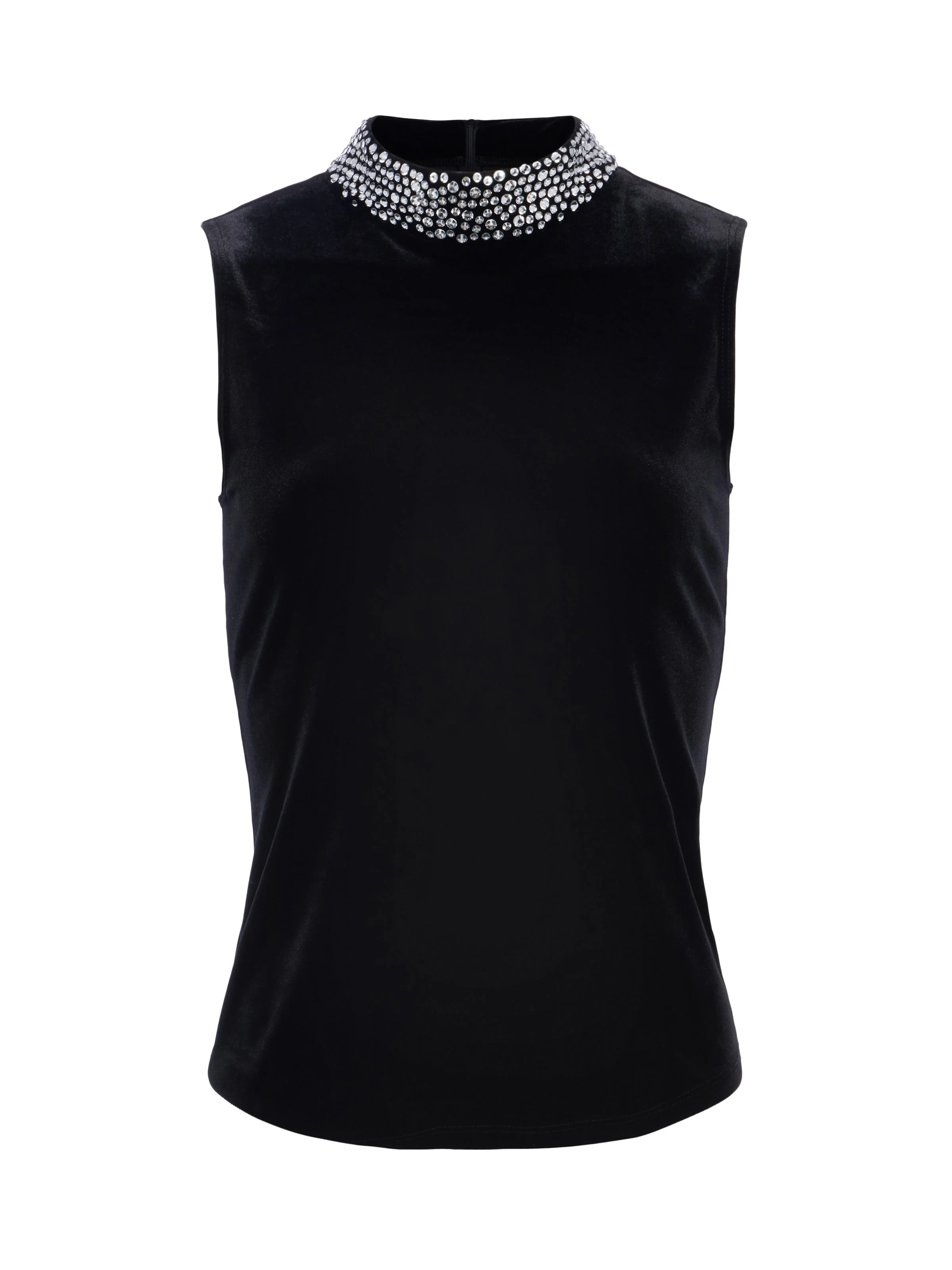 The Madelyn offers an instant hit of glamor with secure crystal embellishments, faced for comfortable wear. • Stretch velvet • Crystal embellished mock neck • Semi-fitted • Hidden back zip closure Style No. 5795FUW-BLAC DETAILS & FIT - Model Details: Height 5'9" | Bust 32" | Waist 24" | Hips 34" | Wearing Size XS - About 23.5" From Shoulder to Hem MATERIALS & CARE Composition - 90% Polyester 10% Spandex - Made in Los Angeles