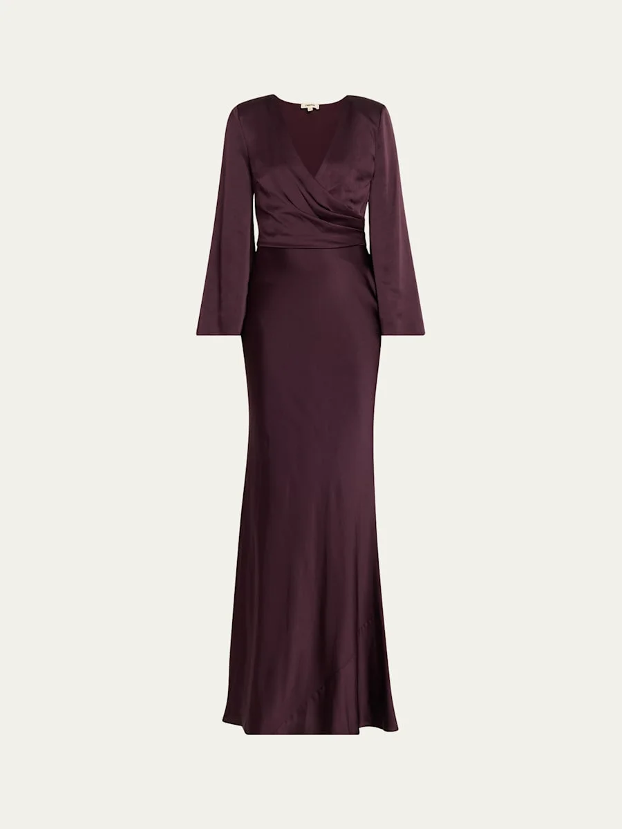 Cut from lustrous satin, the "Manon" dress by L'Agence features a plunging wrap neckline and a floor-sweeping silhouette Approx. 61.3"L from shoulder to hem Surplice neckline Padded shoulders Relaxed long sleeves Full length Body-skimming silhouette Polyester Imported Online Inquiries: BGS21_T8XWU| Store Inquiries: #5485923