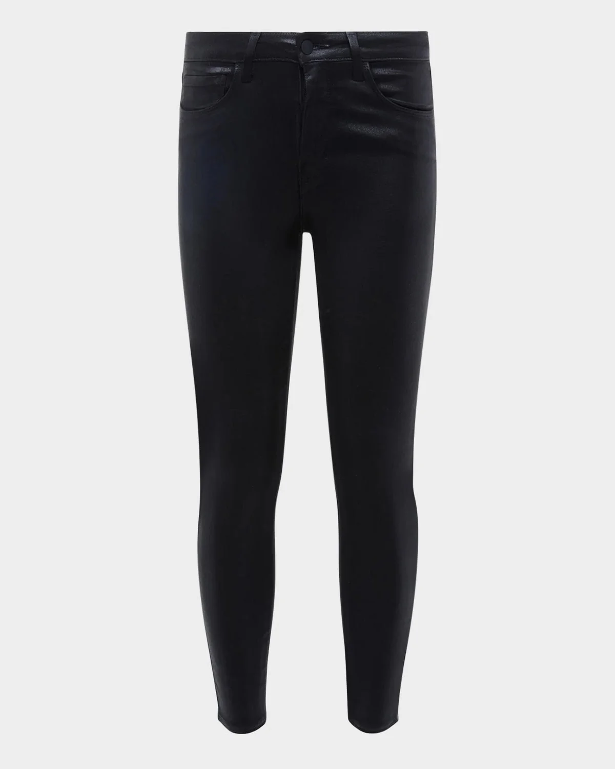 L'Agence "Margot" jeans in coated stretchdenim. Approx. measurements: 9.8" rise; 26" inseam; 9.5" leg opening. Contoured waistband for comfortable, noslip, nogap fit. Highrise; belt loops. Buttonzip fly. Fivepocket style. Formfitting. Skinny legs. Anklelength. Modal/cotton/polyester/spandex. Made in USA of imported materials.
