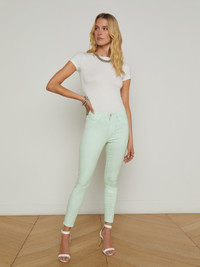 Our iconic cropped skinny jean, built with a contoured waistband that hugs the natural waist without gaping. Now in leather-look coated denim. • Super stretch coated stretch denim • High rise • Front faux pockets • Functional back pockets • Front zip fly and button closure Style No. 2294PDDC-PJDC DETAILS & FIT - Model Details: Height 5'9" | Bust 32" | Waist 24" | Hips 34" | Wearing Size 25 - Rise: 9.5" - Inseam: 26" - Leg Opening: 9.5" MATERIALS & CARE Composition - 86% Cotton 11% Elastane 3% Spandex - Made in Los Angeles Care - Spot wash disinfect - Dry clean only