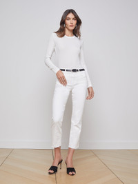 An essential cropped jean with an effortless, relaxed fit in clean white. High-rise, five-pocket design is cut from premium stretch denim that holds its shape while providing supreme comfort. Slim straight leg gently drapes to a raw hem. Style No. 2520ISK-BLAN DETAILS & FIT - Model Details: Height: 5'10" | Bust: 32" | Waist: 24'' | Hips: 34.5'' | Wearing Size 25 - Rise: 9.5" - Inseam: 26" - Leg Opening: 12.75" MATERIALS & CARE Composition - 93% Cotton, 6% Polyester, 1% Spandex - Made in Los Angeles Care - Machine wash
