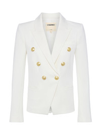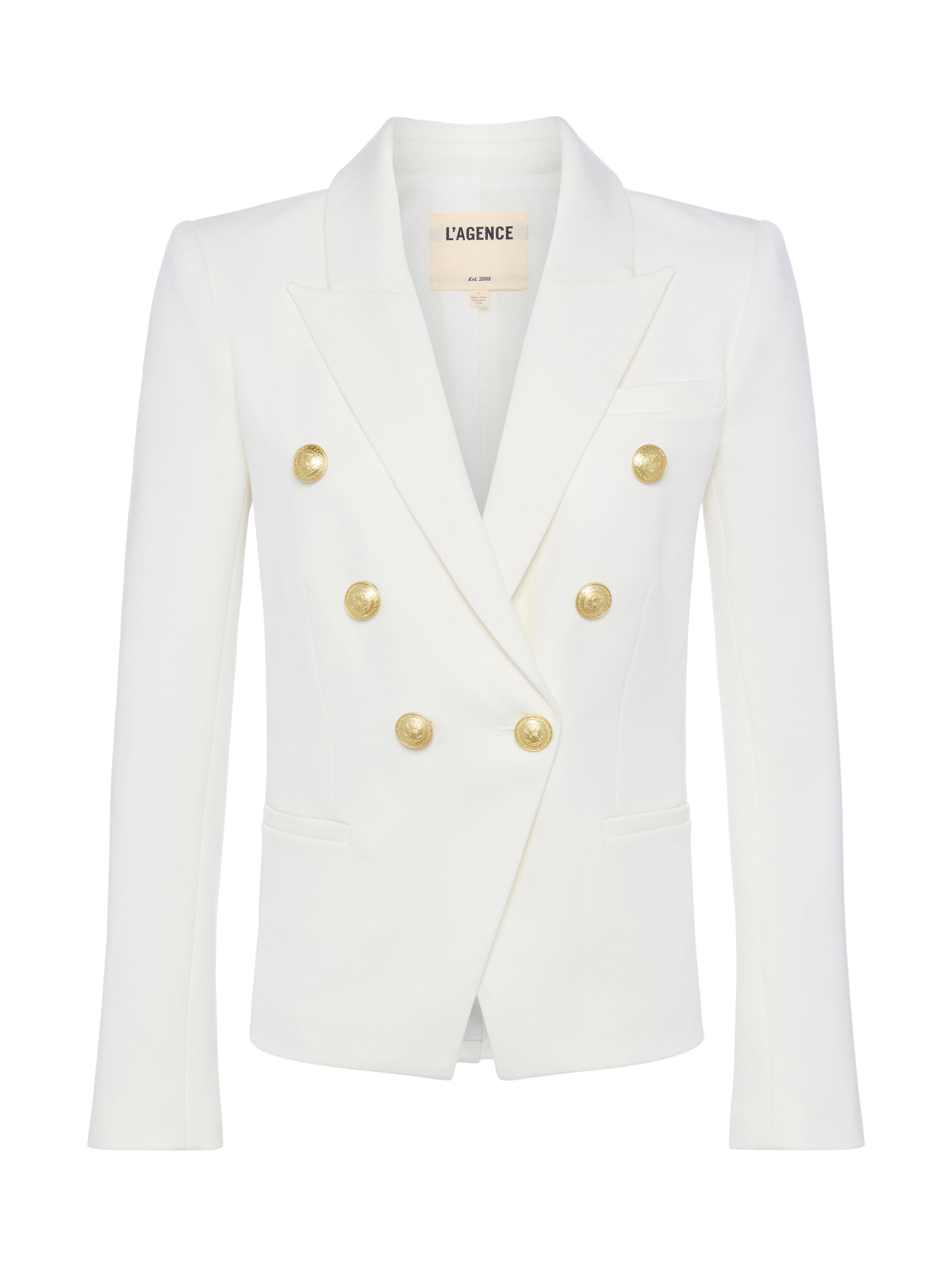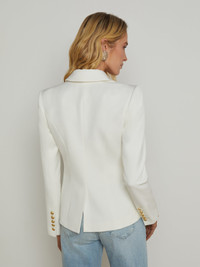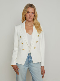 An ultra-flattering double-breasted blazer featuring a defined, cinched waist. Now in true white. • Midweight stretch suiting fabric • Lined • Exaggerated shoulder • Welt pockets • Embossed dome buttons Style No. 1767NGX-WHIT DETAILS & FIT - Model Details: Height 5'9" | Bust 32" | Waist 24" | Hips 34" | Wearing Size 2 - About 25.25" From Shoulder to Hem - Sleeve Length: 25" MATERIALS & CARE Composition - 68% Polyester 29% Rayon 3% Spandex - Imported