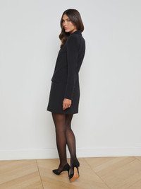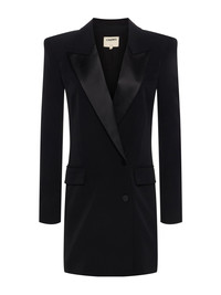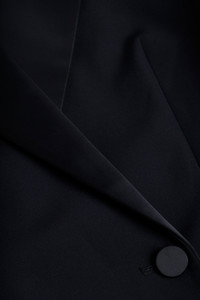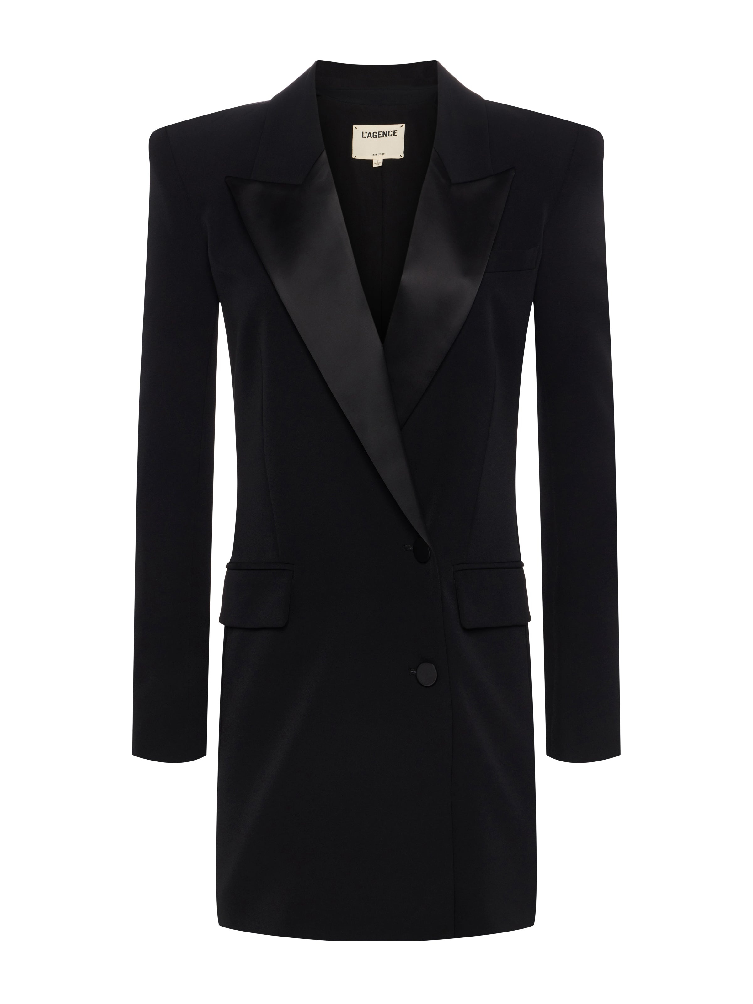 A new kind of power suit. Strong, feminine, and perfect for office to evening in versatile true black. • Italian suiting fabric with mechanical stretch • Tailored fit with strong shoulders • Satin peaked lapels • Flap pockets • Satin button closures • Fully lined Style No. 61362SVE-BLAC DETAILS & FIT - Model Details: Height 5'10" | Bust 32" | Waist 24'' | Hips 34.5'' | Wearing Size 2 - About 33.8" From Shoulder to Hem - Sleeve Length: 24.8" MATERIALS & CARE Composition - 92% Polyester 8% Spandex - Imported Care - Professionally dry clean only - Do not wash - No tumble dry