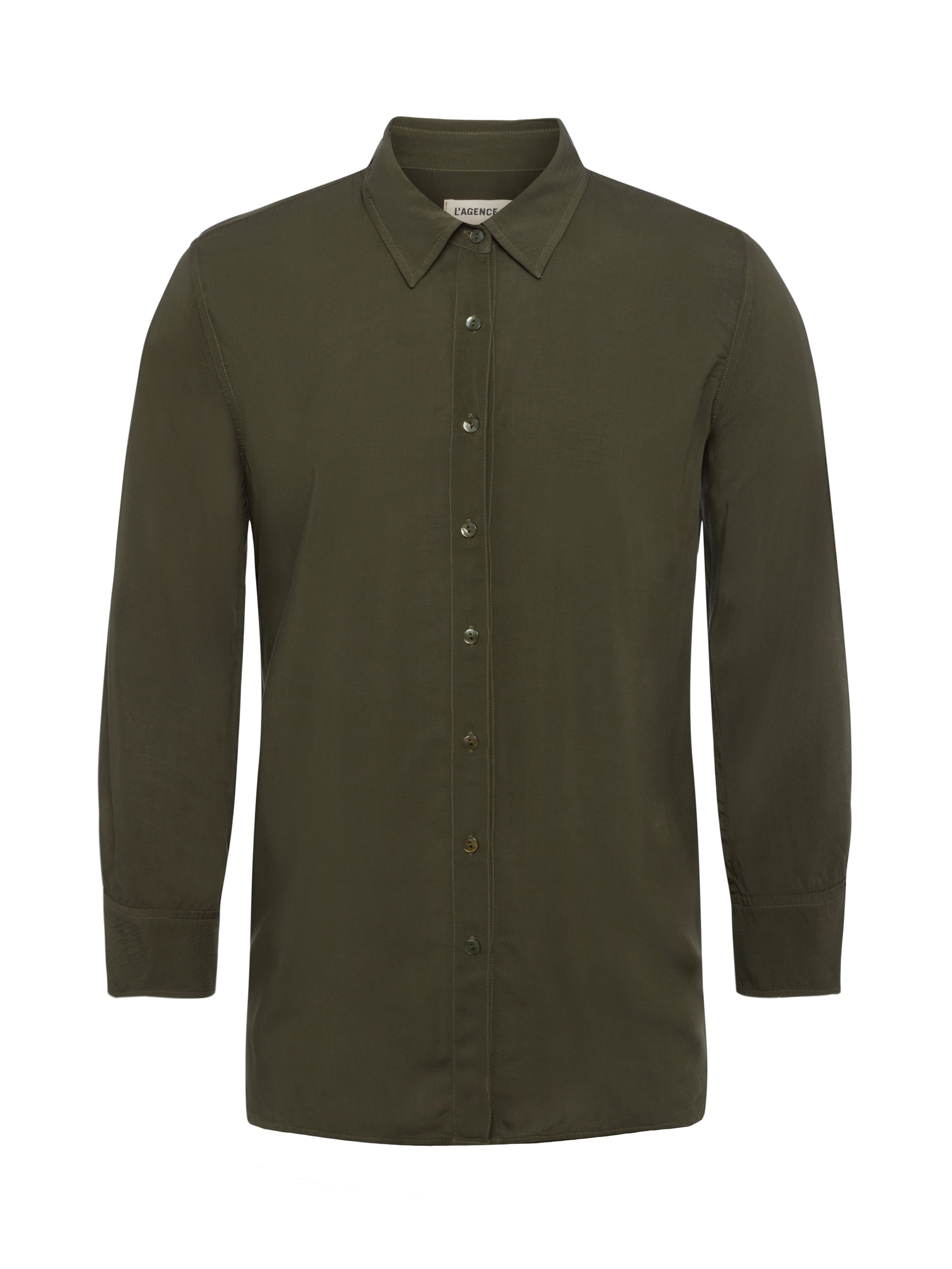 Your easiest button-down is here, now in dark green. • Twill shirting fabric • 3/4 sleeves • Relaxed fit • Front button closures Style No. 40643JDR-ARMY DETAILS & FIT - Model Details: Height 5'9" | Bust 30" | Waist 24" | Hips 34" | Wearing Size XS - About 26" From Shoulder to Hem - Sleeve Length: 18.3" MATERIALS & CARE Composition - 100% Viscose - Imported Care - Dry clean only