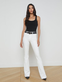 The Marty jean features our longest inseam, widest flared hem, and a slim fit from just above the natural waist to the knee. Now in white leather-look coated denim. • Super stretch coated denim • Ultra high-rise flare • Faux front pockets • Functional back pockets • Zip fly and button closure • 35" inseam Style No. 2707PDDC-BCCT DETAILS & FIT - Model Details: Height 5'9.5" | Bust 32" | Waist 24" | Hips 35" | Wearing Size 25 - Rise: 10" - Inseam: 35" - Leg Opening: 21.5" MATERIALS & CARE Composition - 86% Cotton 11% Elastane 3% Spandex - Made in Los Angeles Care - Spot wash disinfect - Dry clean only