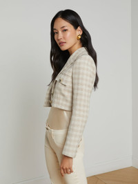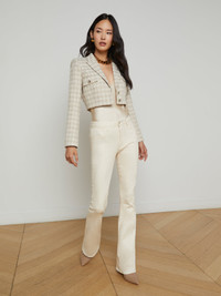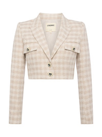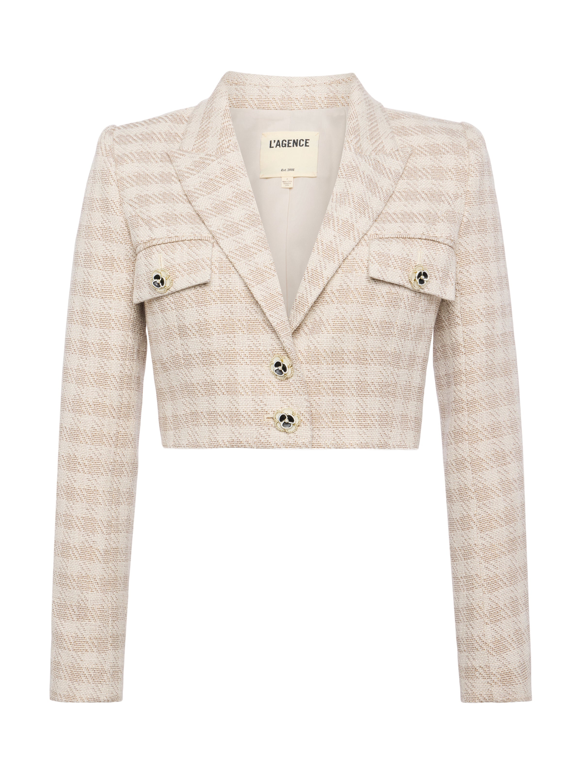 C’est chic! An ultra cropped cut and luxe floral buttons put a modern, feminine spin on this classic checked tweed jacket. • Cotton-blend tweed • Fully lined • Patch pockets • Strong shoulder • Front button closure Style No. 1853THK-ECGO DETAILS & FIT - Model Details: Height 5'9" | Bust 30" | Waist 24" | Hips 34" | Wearing Size 2 - About 16.5" From Shoulder to Hem - Sleeve Length: 24.3" MATERIALS & CARE Composition - 72% Polyester 28% Cotton - Imported