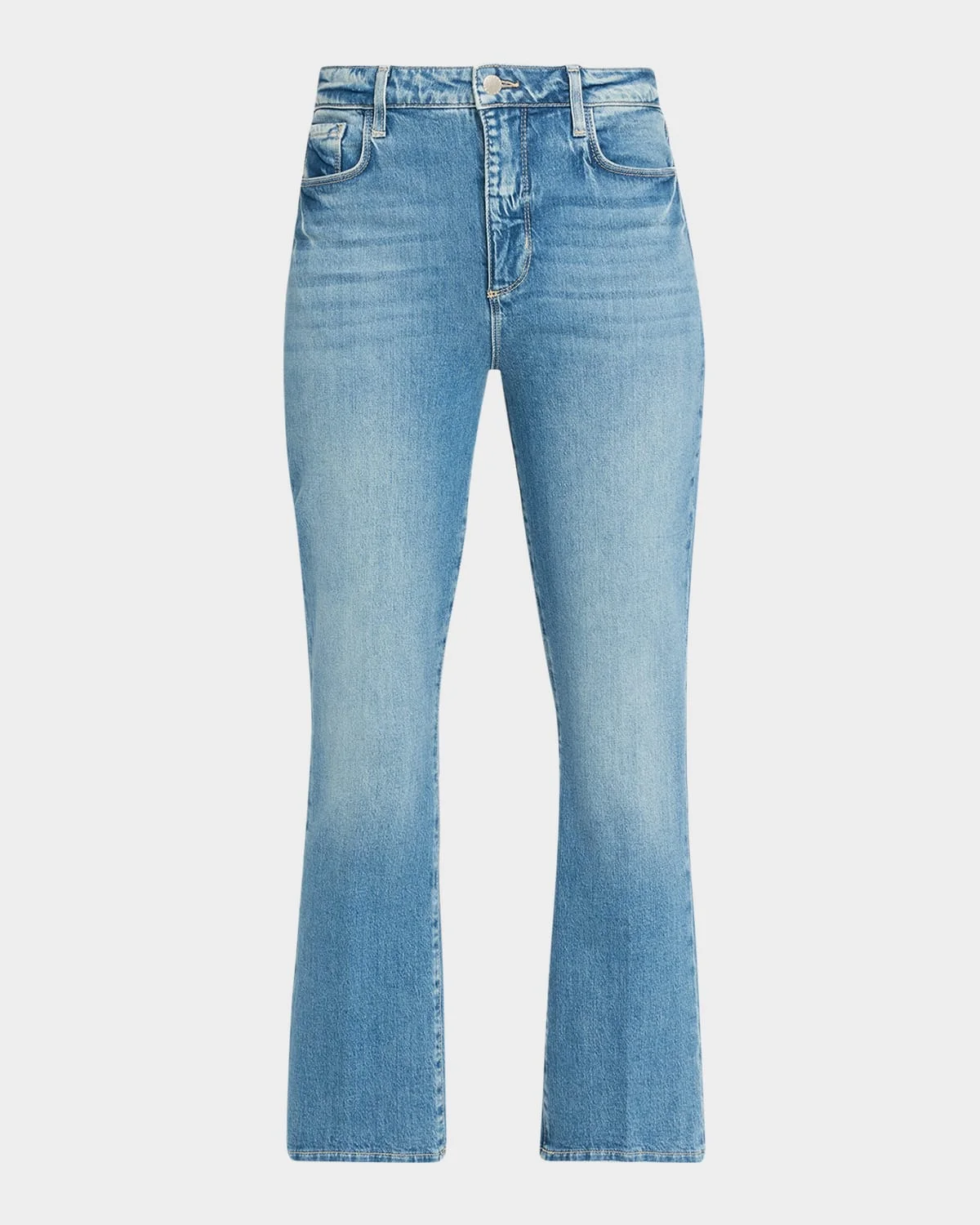 L'Agence "Mira" micro bootcut jeans in faded mediumwash denim Approx. 27" inseam Ultra high rise Fivepocket style Fitted through the hip and thighs Cropped length Button/zip fly; belt loops Cotton/lyocell/elastane Made in USA
