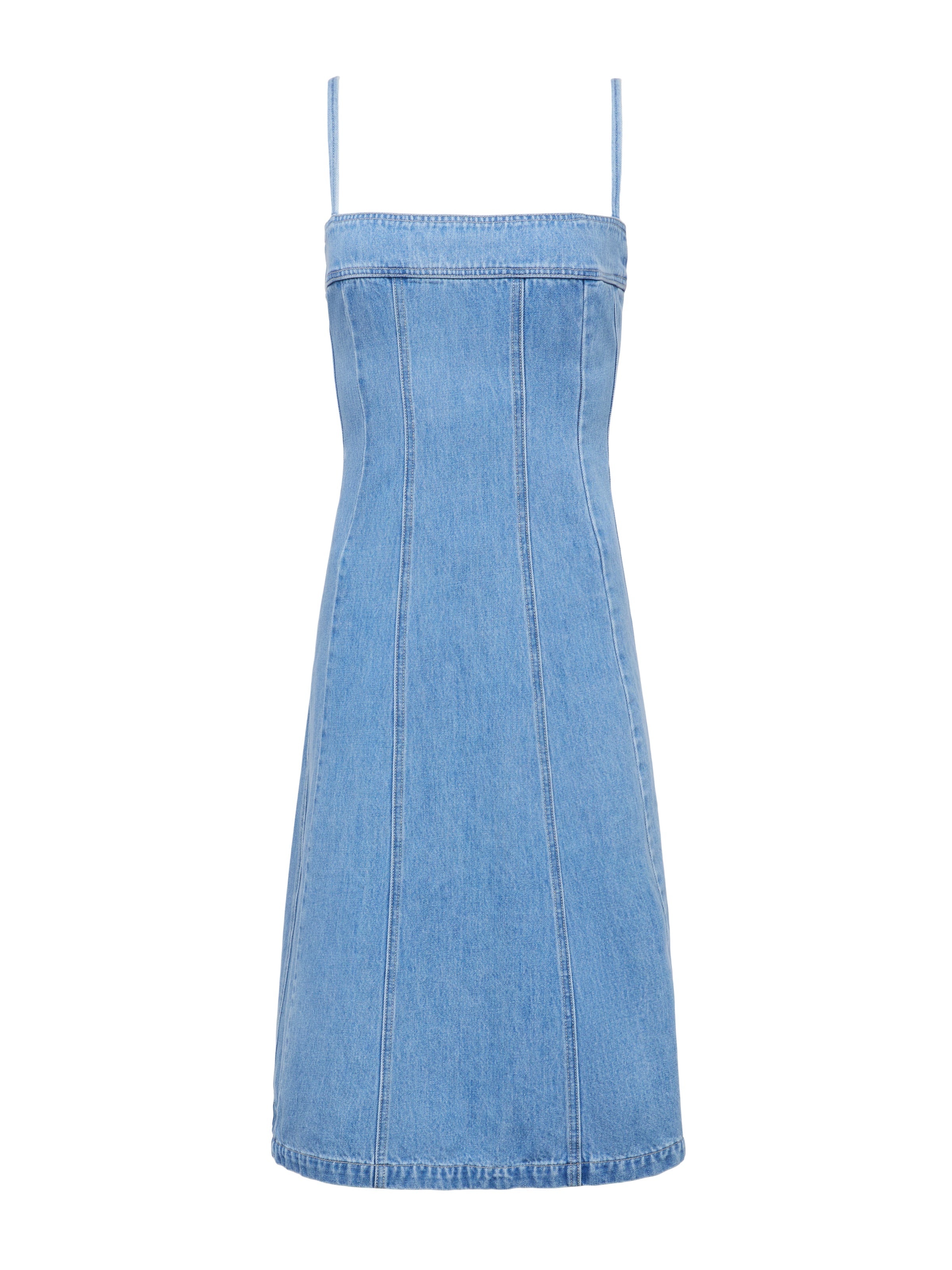 A sweet fit and flare dress constructed with figure-defining seams for a flattering fit. • All-cotton denim • Exposed back zip Style No. 61573YRO-LEGD DETAILS & FIT - Model Details: Height 5'9" | Bust 32" | Waist 24" | Hips 34" | Wearing Size 2 - About 37.5" From Shoulder to Hem MATERIALS & CARE Composition - 100% Cotton - Made in Los Angeles Care - Machine wash