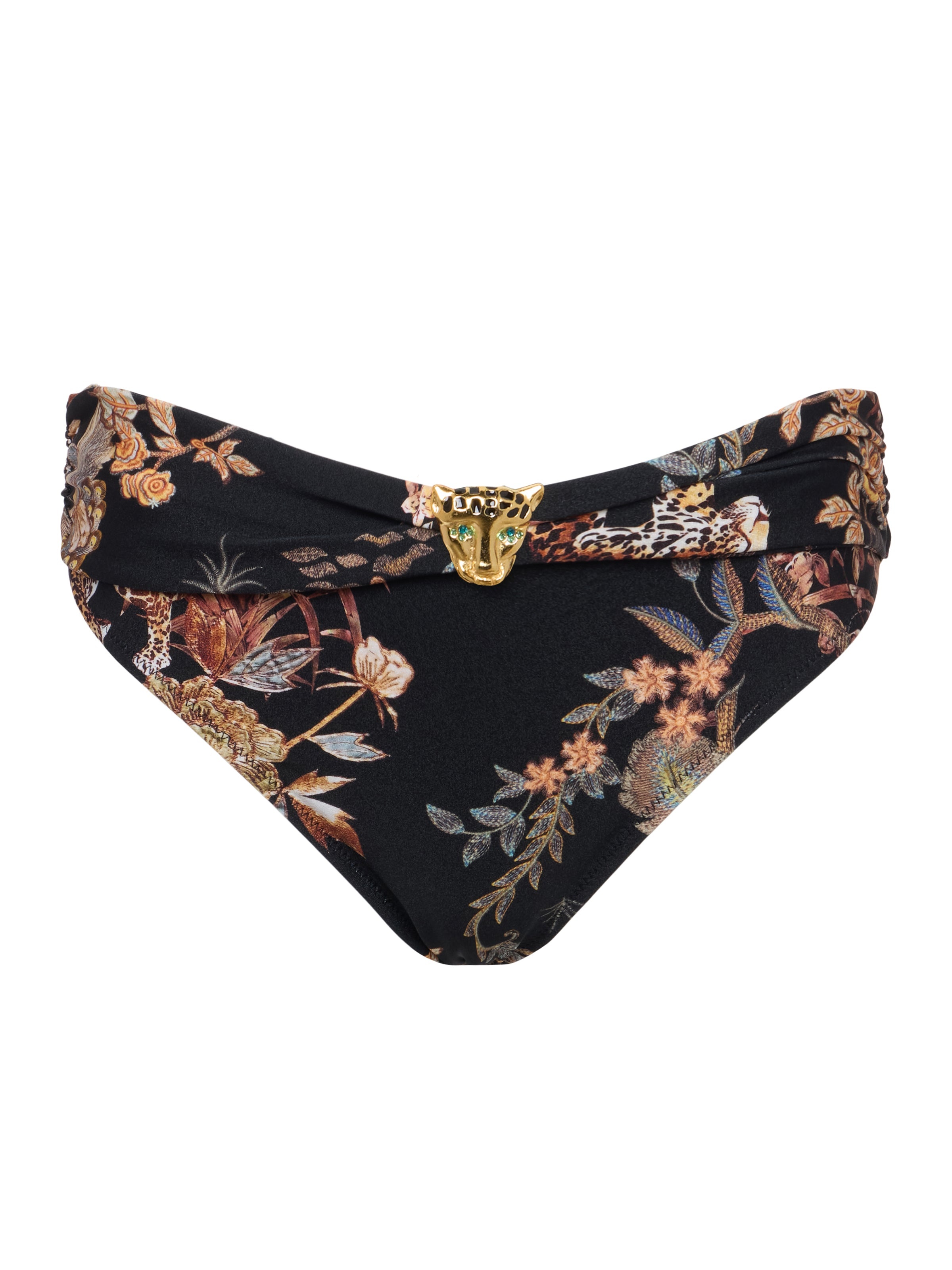 The classic black bikini bottom, updated with a flattering ruched waistband and gold leopard hardware. • Four-way stretch nylon • Moderate coverage • Ruched waistband with gold leopard hardware Style No. LG5AR96-BMTL DETAILS & FIT - Model Details: Height 5'10" | Bust 32" | Waist 24" | Hips 34.5" | Wearing Size XS - Moderate Coverage MATERIALS & CARE Composition - 80% Nylon 20% Elastane - Imported Care - Hand wash