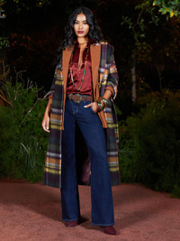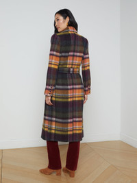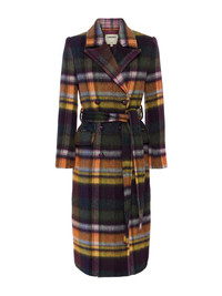 Classic meets chic in our plaid Olina coat. • Wool blend fabric • Fully lined • Double-breasted front closure with tie belt • Flap pockets • Embossed dome buttons • Back hem vent Style No. 1723PVL-MUPL DETAILS & FIT - Model Details: Height 5’10" | Bust 34” | Waist 24" | Hips 35” | Wearing Size 2 - About 47.75" From Shoulder to Hem - Sleeve Length: 24.5" MATERIALS & CARE Composition - 70% Wool 20% Polyamide 5% Other Fibers 5% Acrylic - Imported Care - Dry clean only