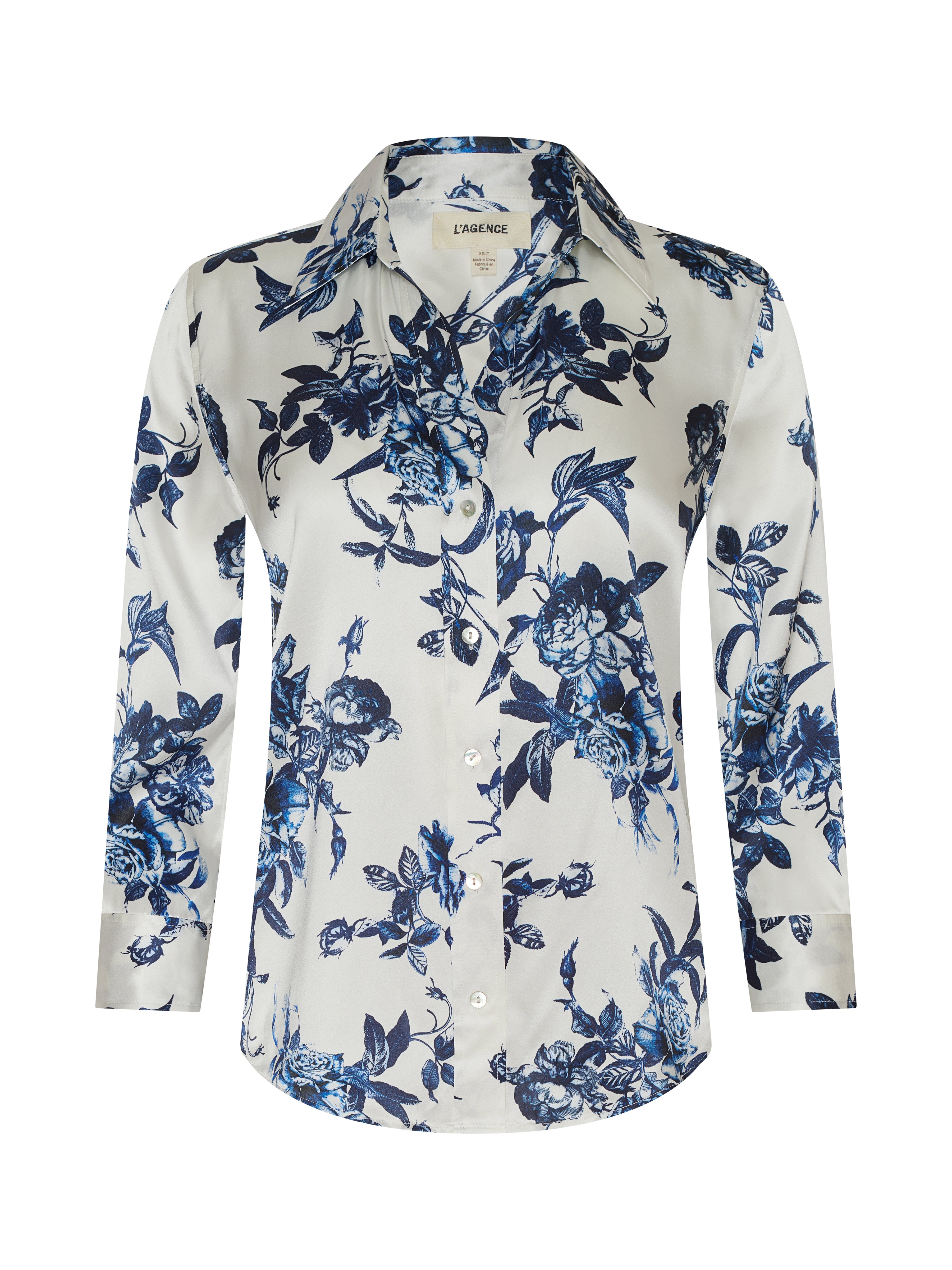 Meet the iconic silk button-down that belongs in every wardrobe. Our signature three-quarter sleeve shirt is back in a blue floral print. • 100% silk charmeuse • 3/4 sleeves • High-low shirttail hem • Slim fit • Front button closure Style No. 40126FFT-PASF DETAILS & FIT - Model Details: Height 5'8" | Bust 32" | Waist 24.5" | Hips 34" | Wearing Size XS - About 26" From Shoulder to Hem - Sleeve Length: 19.2" MATERIALS & CARE Composition - 100% Silk - Imported Care - Dry clean only - Do not wash - No bleach - No tumble dry - Low iron if needed