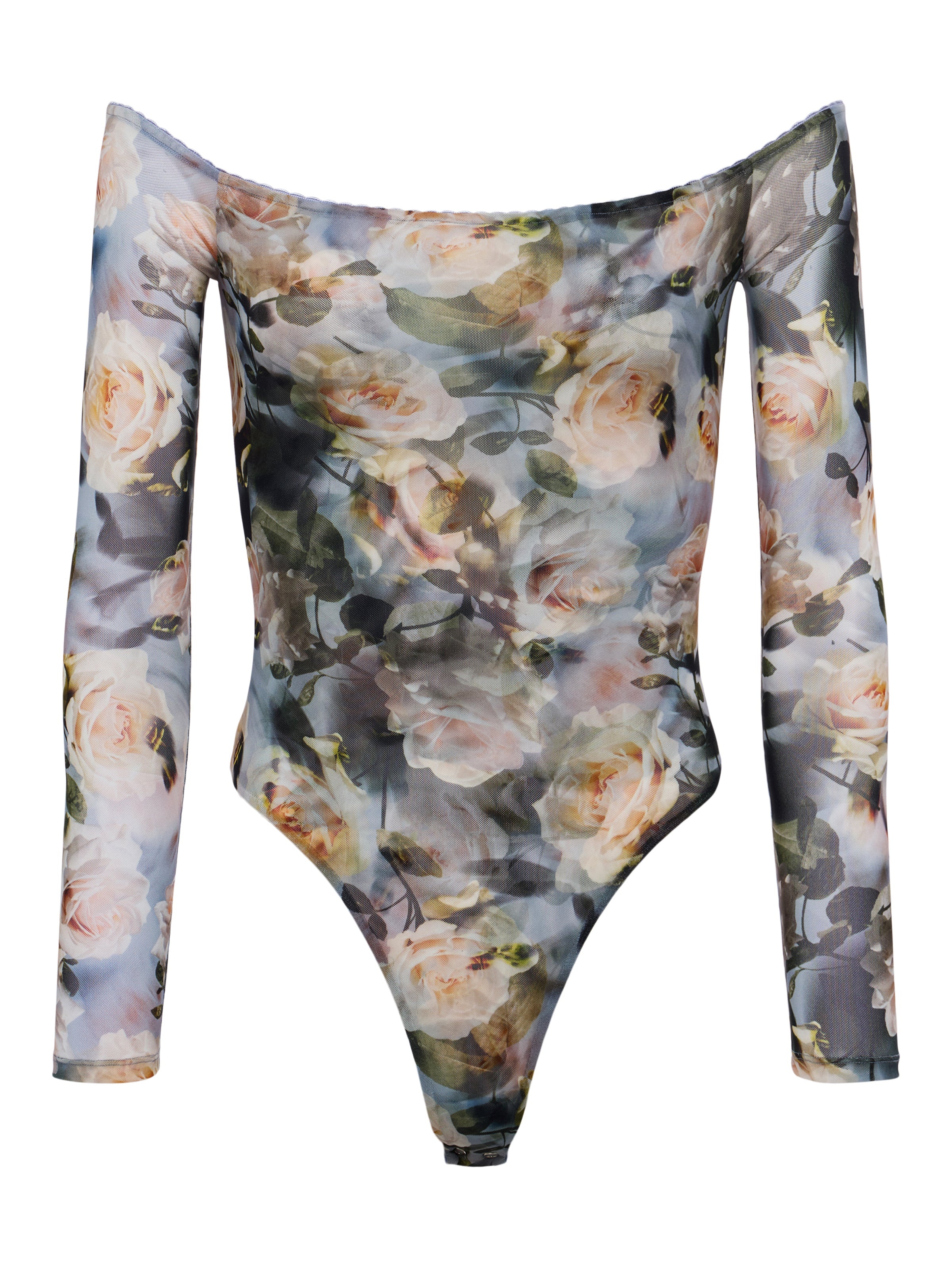 A subtly sexy off-the-shoulder bodysuit, perfect for day to night. Now back in a soft, feminine floral print. • Featherweight stretch mesh • Slim fit • Lined front and back bodice • Unlined sleeves • Scalloped trim • Gusset snap closure Style No. 5765DCO-MUSF DETAILS & FIT - Model Details: Height 5'9" | Bust 30" | Waist 24" | Hips 34" | Wearing Size XS - About 21.5" From Top to Bottom - Sleeve Length: 21.25" MATERIALS & CARE Composition - 90% Nylon 10% Spandex - Imported