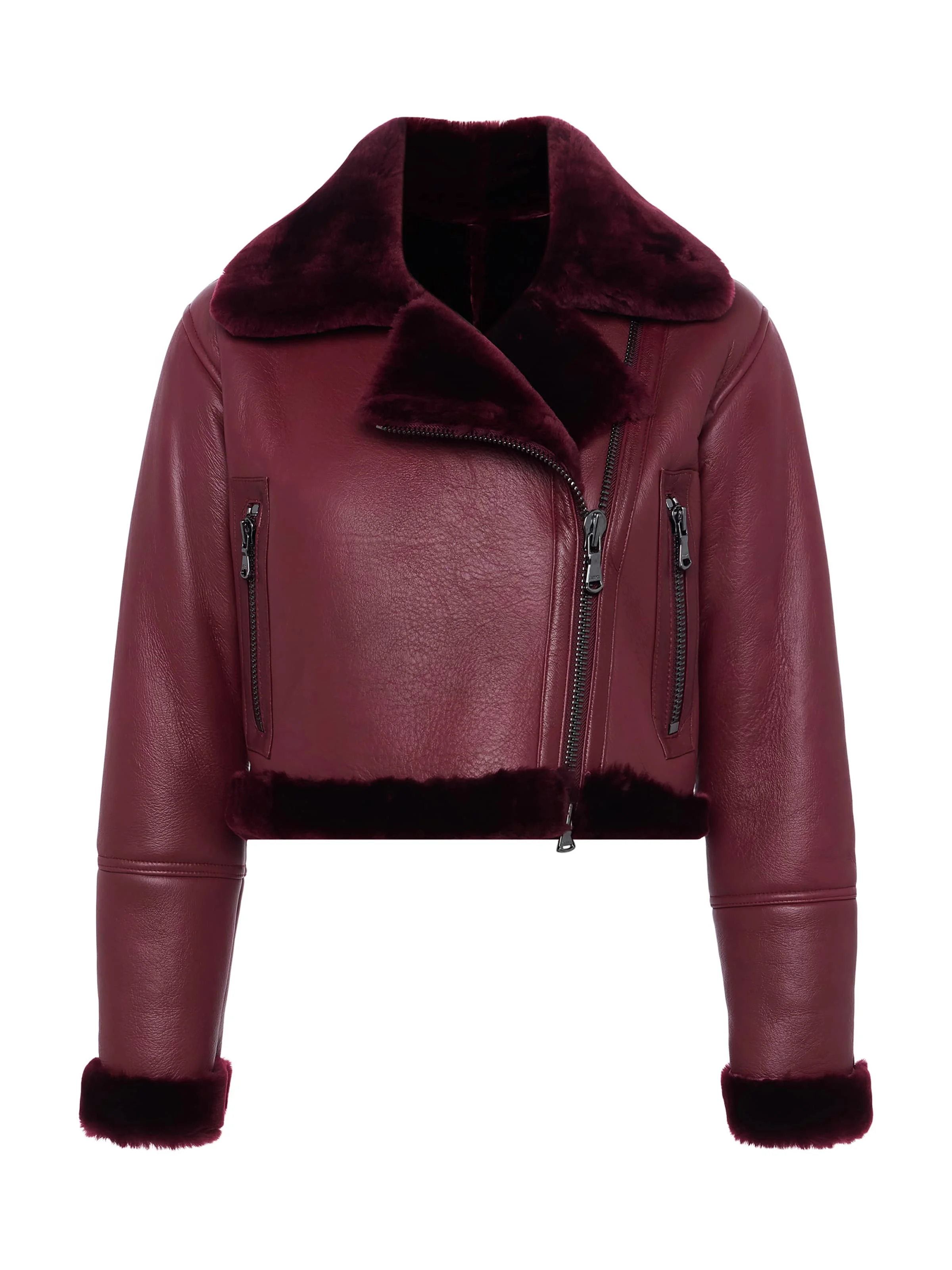 Style No. 1831SAF-WINE DETAILS & FIT - Model Details: Height 5'10" | Bust 34" | Waist 24" | Hips 35" | Wearing Size XS - About 18.25" From Shoulder to Hem - Sleeve Length: 23" MATERIALS & CARE Composition - 100% Lambskin - Imported Care - Dry clean only with leather professional - Do not wash - Do not use bleach - Do not tumble dry - Do not iron - Color transfer or crocking may occur and is especially common with dyed lots