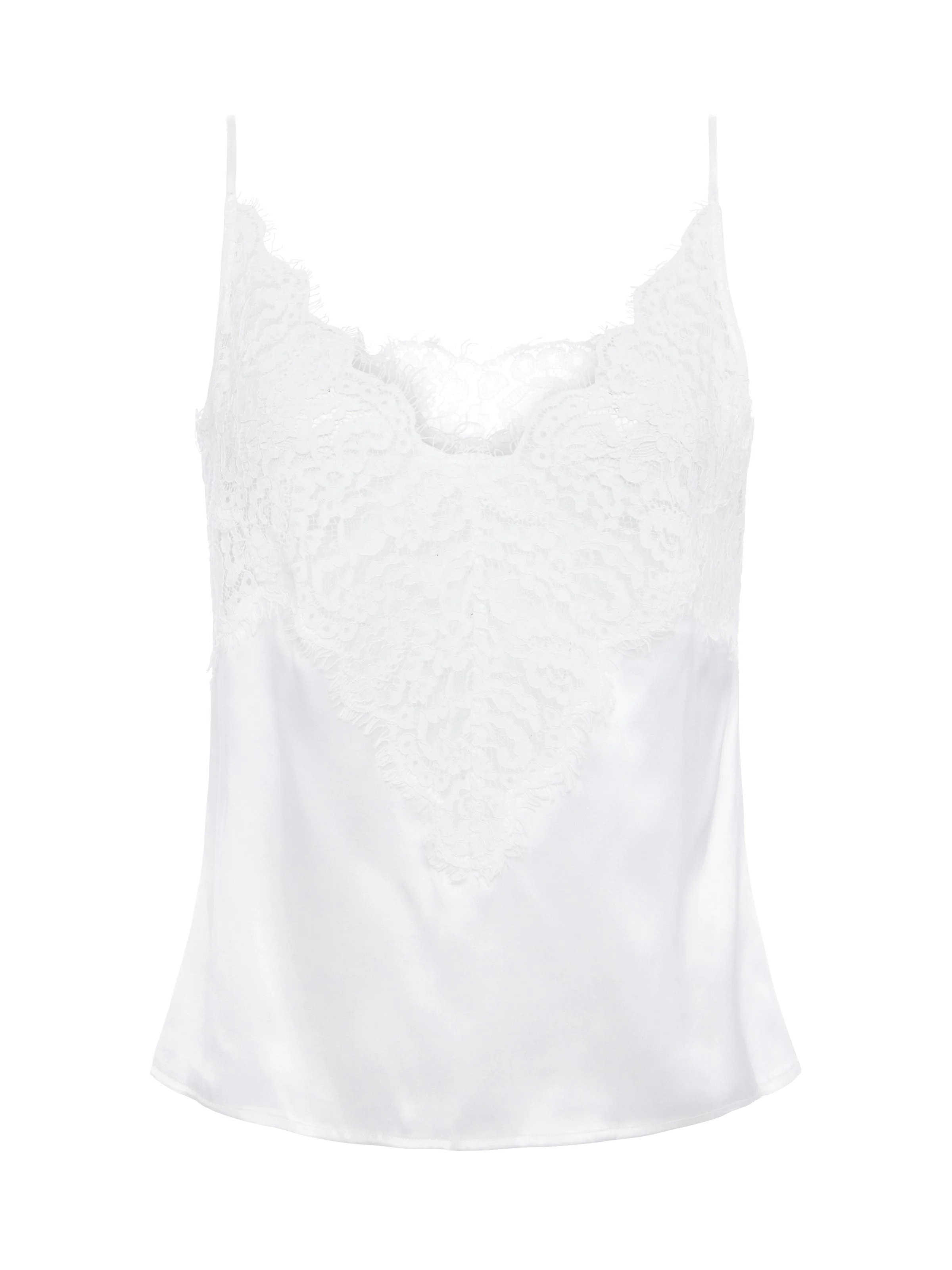 Sheer lace adds a subtle lingerie-inspired appeal to our signature silk camisole in timeless white. • 100% silk charmeuse • Unlined • Scalloped lace inset • Relaxed fit • Deep V-neck • Adjustable straps Style No. 40536CLW-WHIT DETAILS & FIT - Model Details: Height 5'10" | Bust 32" | Waist 24'' | Hips 34.5'' | Wearing Size XS - About 18.5" From Shoulder to Hem MATERIALS & CARE Composition - 100% Silk - Imported