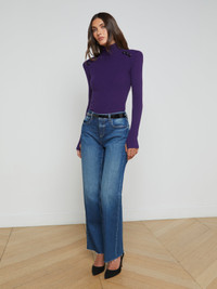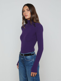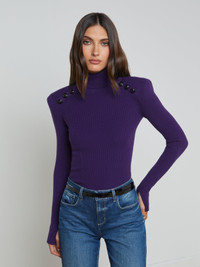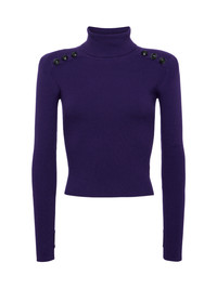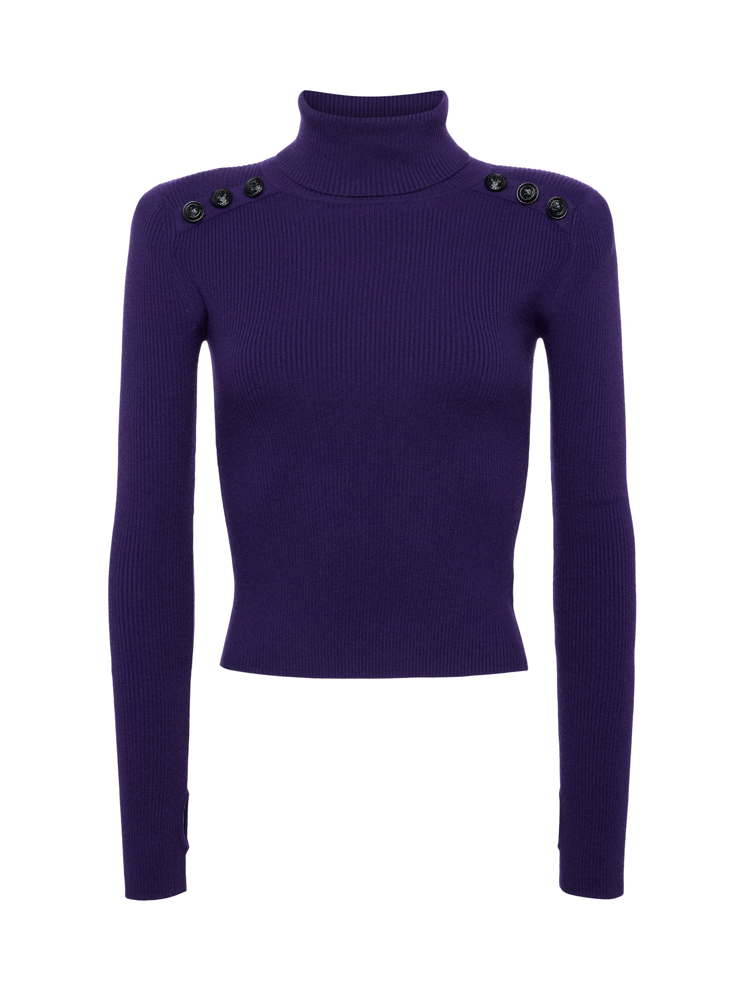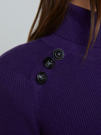 Strong shoulders and button accents create a powerful, sleek silhouette in this cool twist on the turtleneck. Now in deep purple. • Soft ribbed knit • Slim fit • Extended sleeves with thumb holes • Decorative embossed dome buttons Style No. 8948TXN-DPPB DETAILS & FIT - Model Details: Height 5'10" | Bust 32" | Waist 24" | Hips 34.5" | Wearing Size XS - About 21.25" From Shoulder to Hem - Sleeve Length: 25.75" MATERIALS & CARE Composition - 50% Rayon 22% Nylon 28% Polyester - Imported