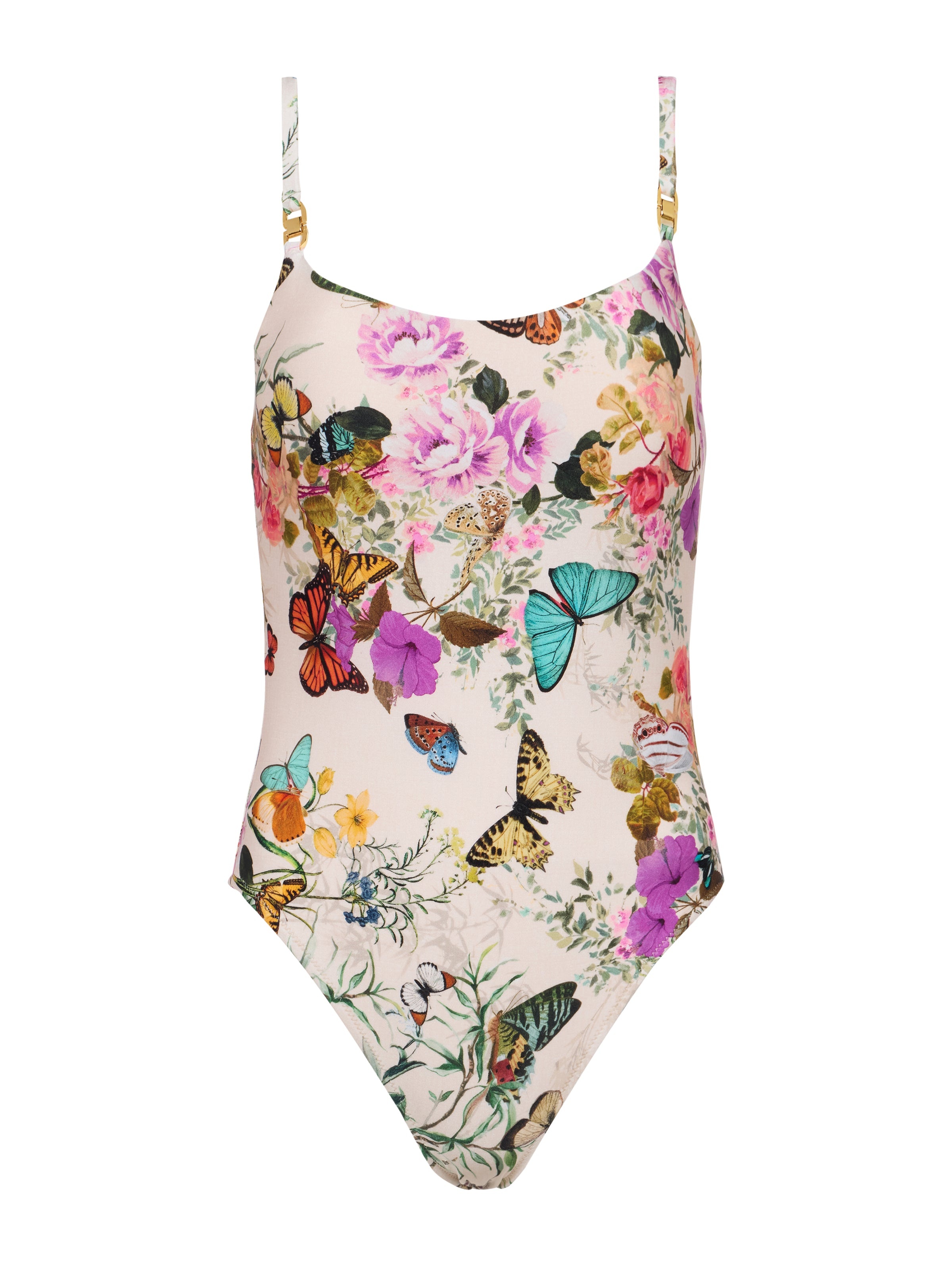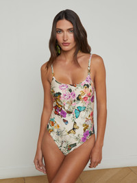 Our classic one-piece maillot swimsuit, now in a striking butterfly print. • Four-way stretch nylon • Additional layer of lining for shape and support • High-leg cut • Removable cups • Hidden underwire construction • Adjustable straps Style No. LG5AS05-VCBF DETAILS & FIT - Model Details: Height 5'10" | Bust 32" | Waist 24" | Hips 34.5" | Wearing Size XS MATERIALS & CARE Composition - 80% Nylon 20% Elastane - Imported Care - Hand wash