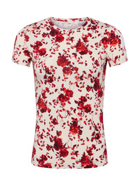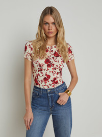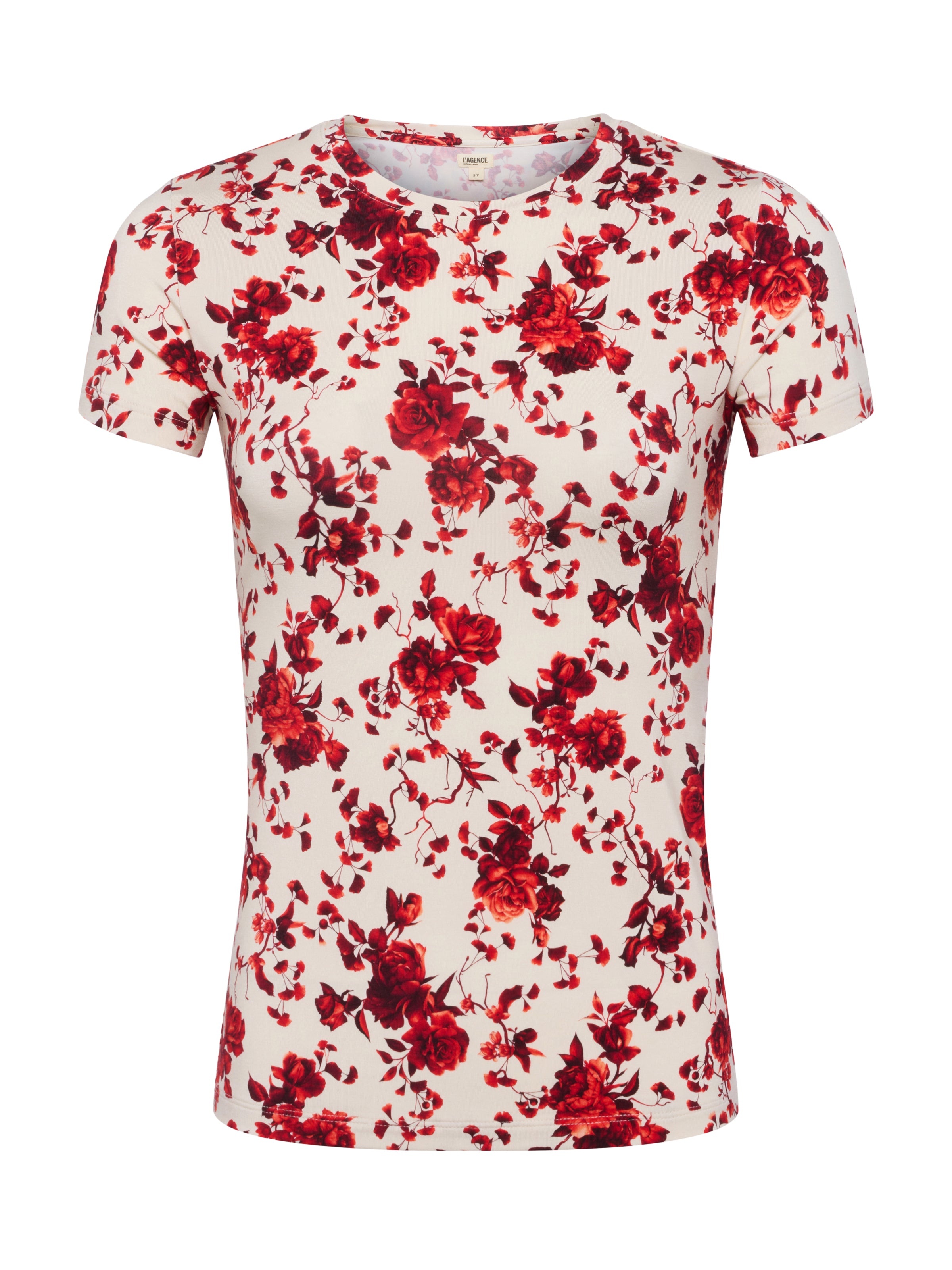In a soft, supple fabrication and slim cut, Ressi is our most flattering short sleeve tee. This L'AGENCE favorite is back in a white and red floral print. • Ultra soft rayon • Slim fit • Crew neck Style No. 5507CBI-IRIK DETAILS & FIT - Model Details: Height 5'10.5" | Bust 33" | Waist 24" | Hips 34" | Wearing Size XS - About 24.75" From Shoulder to Hem - Sleeve Length: 5.25" MATERIALS & CARE Composition - 92% Rayon 8% Spandex - Made in Los Angeles Care - Hand wash