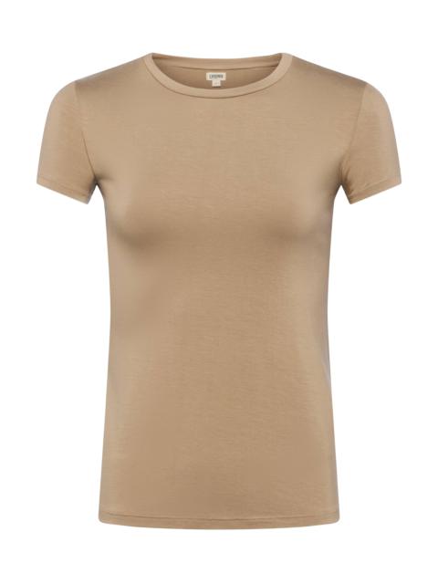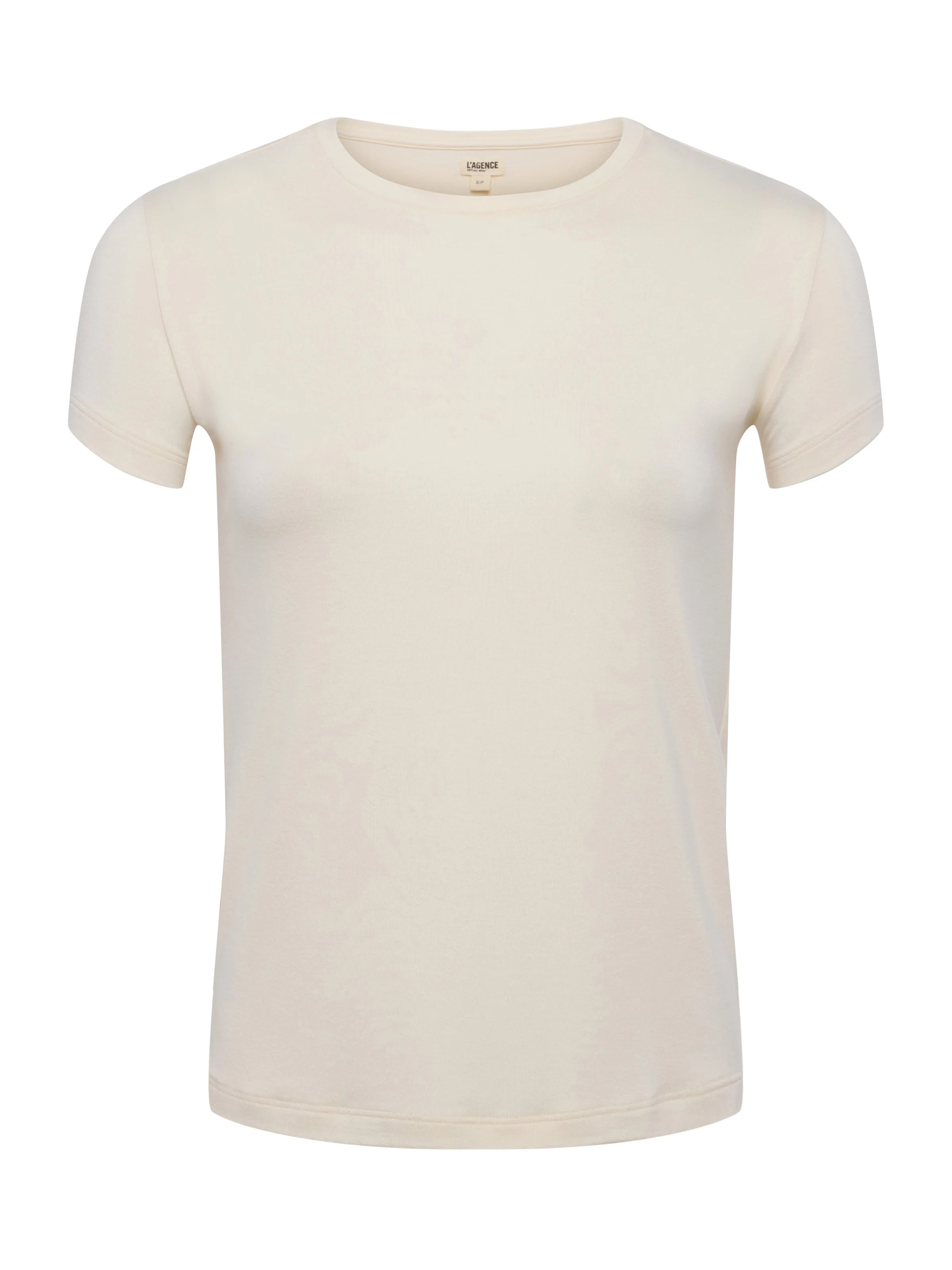 In a soft, supple fabrication and slim cut, Ressi is our most flattering short sleeve tee. This L'AGENCE favorite is back in a vintage white. • Microfiber modal jersey • Slim fit • Crew neck Style No. 5507MJT-VIWH DETAILS & FIT - Model Details: Height 5'10" | Bust 32" | Waist 24" | Hips 34.5" | Wearing Size XS - About 24.75" From Shoulder to Hem - Sleeve Length: 5.25" MATERIALS & CARE Composition - 93% Rayon 7% Spandex - Made in Los Angeles Care - Hand wash