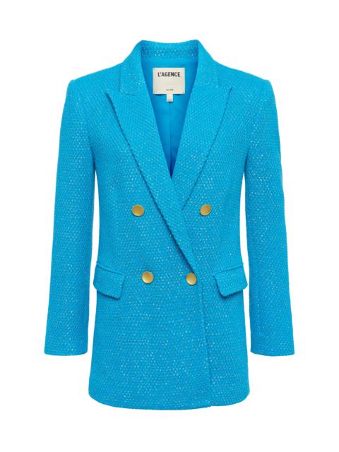 Fresh, polished, and endlessly wearable. The Riva blazer features a modern oversized fit crafted from a luxurious knit infused with lurex for a subtle sparkle. • Italian knit fabric spun with lurex • Fully lined • Double-breasted style • Decorative flap pockets • 4-button cuffs • Embossed dome buttons Style No. 1809SFD-BIVG DETAILS & FIT - Model Details: Height 5'9" | Bust 32" | Waist 24" | Hips 34" | Wearing Size 2 - About 30.25" From Shoulder to Hem - Sleeve Length: 23.3" MATERIALS & CARE Composition - 58% Cotton 32% Polyester 10% Other - Imported