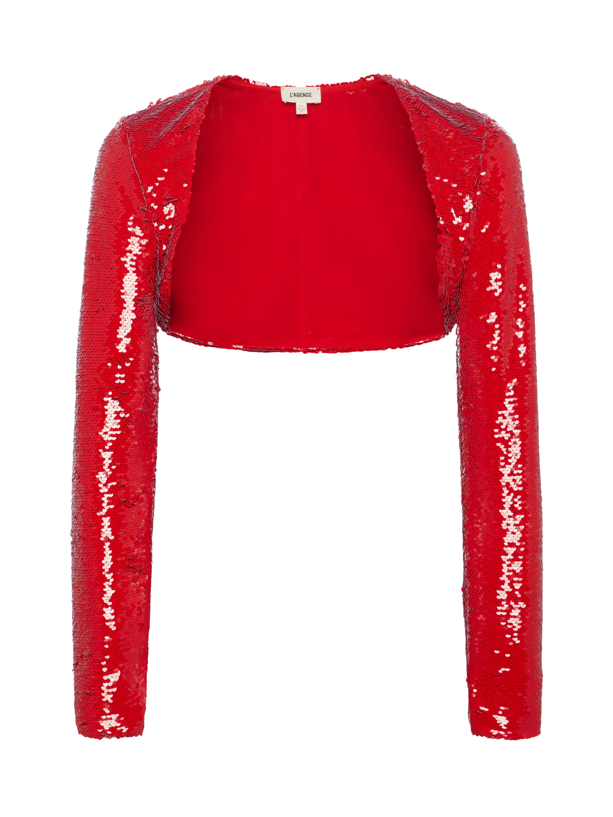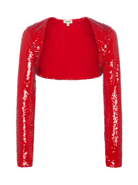 A stunning, bold red sequin shrug for any occasion that calls for statement sleeves. • Sequined fabric • Fully lined • Cropped silhouette • Open-front style Style No. 40651REO-REDS DETAILS & FIT - Model Details: Height 5'10" | Bust 32" | Waist 24'' | Hips 34.5'' | Wearing Size XS - About 10.75" From Shoulder to Hem - Sleeve Length: 22.75" MATERIALS & CARE Composition - 100% Polyester - Imported Care - Spot clean only - No dry clean