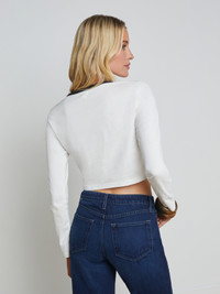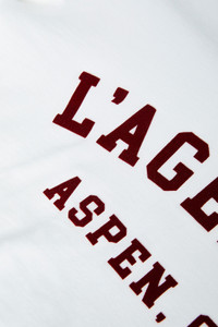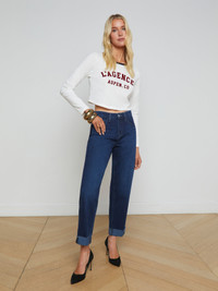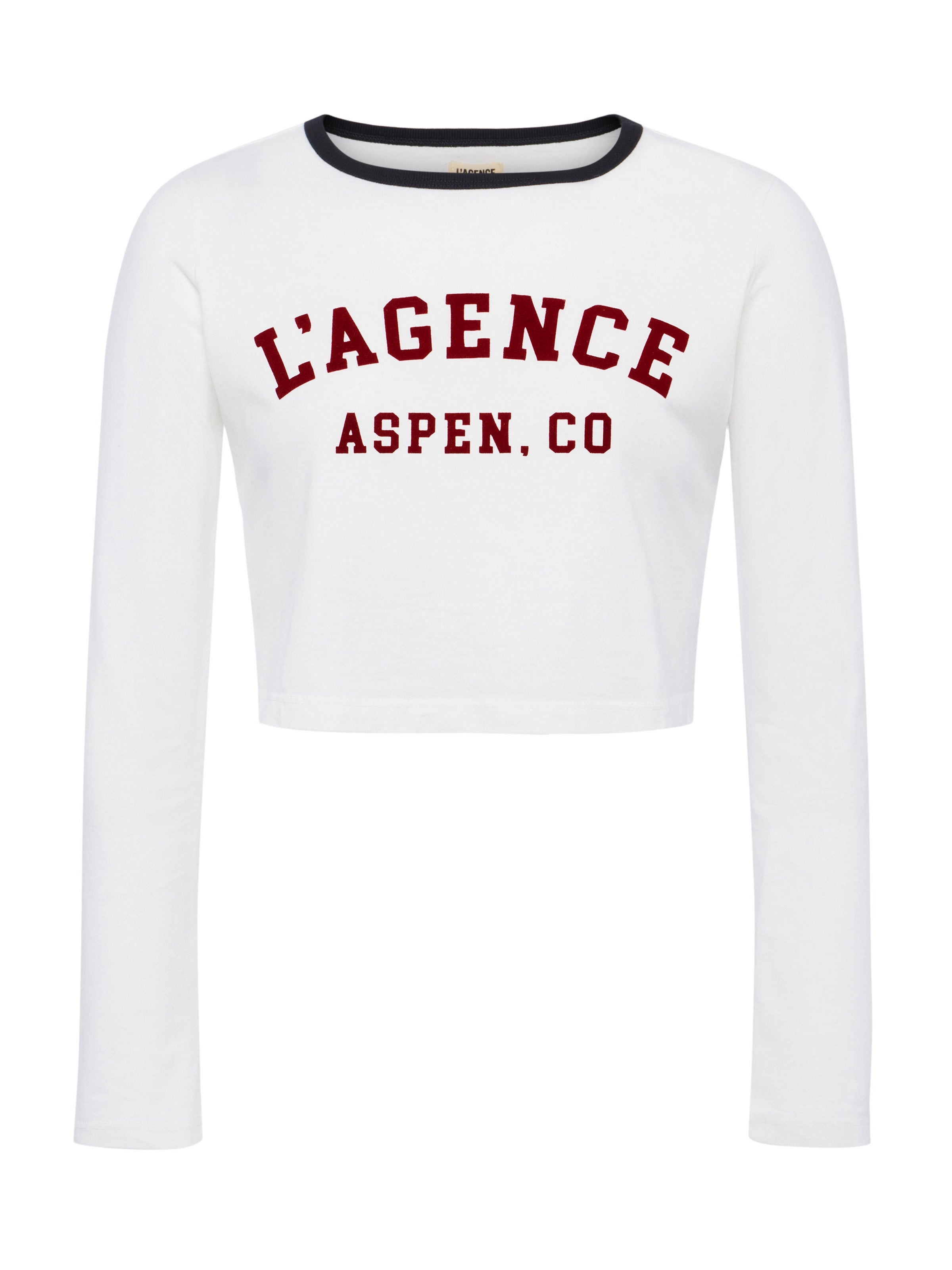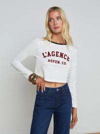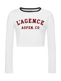 Meet our long sleeve logo tee, a buttery soft loungewear essential. • 100% supima cotton • Contrast ribbed crew neck • Red flocked L'AGENCE logo • Cropped length Style No. 5798SJAZ-WHBL DETAILS & FIT - Model Details: Height 5'9" | Bust 32" | Waist 24" | Hips 34" | Wearing Size XS - About 17" From Shoulder to Hem - Sleeve Length: 23.5" MATERIALS & CARE Composition - 100% Supima Cotton - Made in Los Angeles
