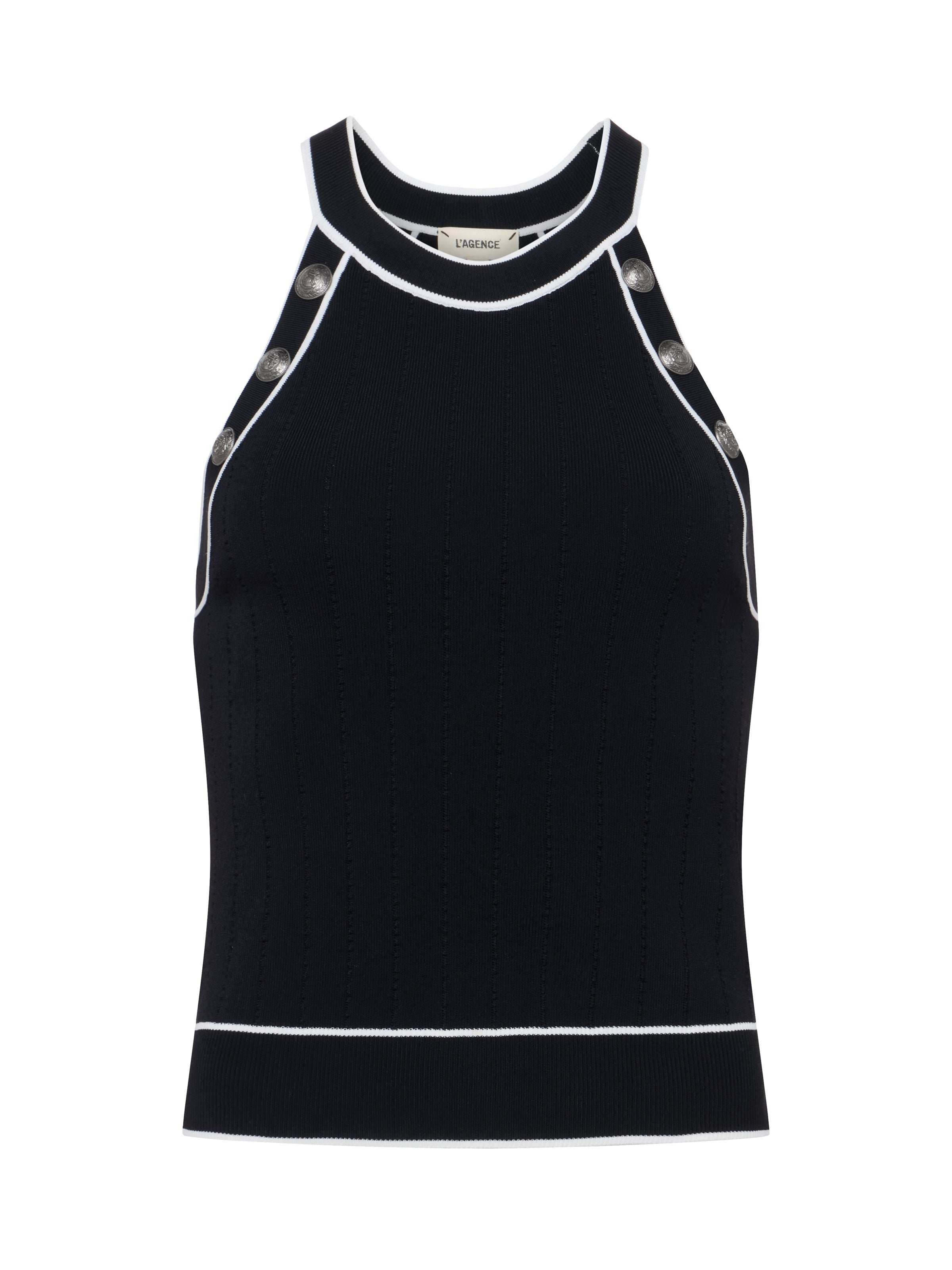The Rosemary is a stretch knit tank, featuring a sporty high neckline, contrast trims, and silver hardware that adds just the right amount of edge. • Power knit • Pullover style • Decorative embossed dome buttons Style No. 80080NXC-BKWT DETAILS & FIT - Model Details: Height 5'9" | Bust 32" | Waist 24" | Hips 34" | Wearing Size XS - About 18.25" From Shoulder to Hem MATERIALS & CARE Composition - 60% Rayon 38% Nylon 2% Spandex - Imported Care - Dry clean only