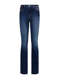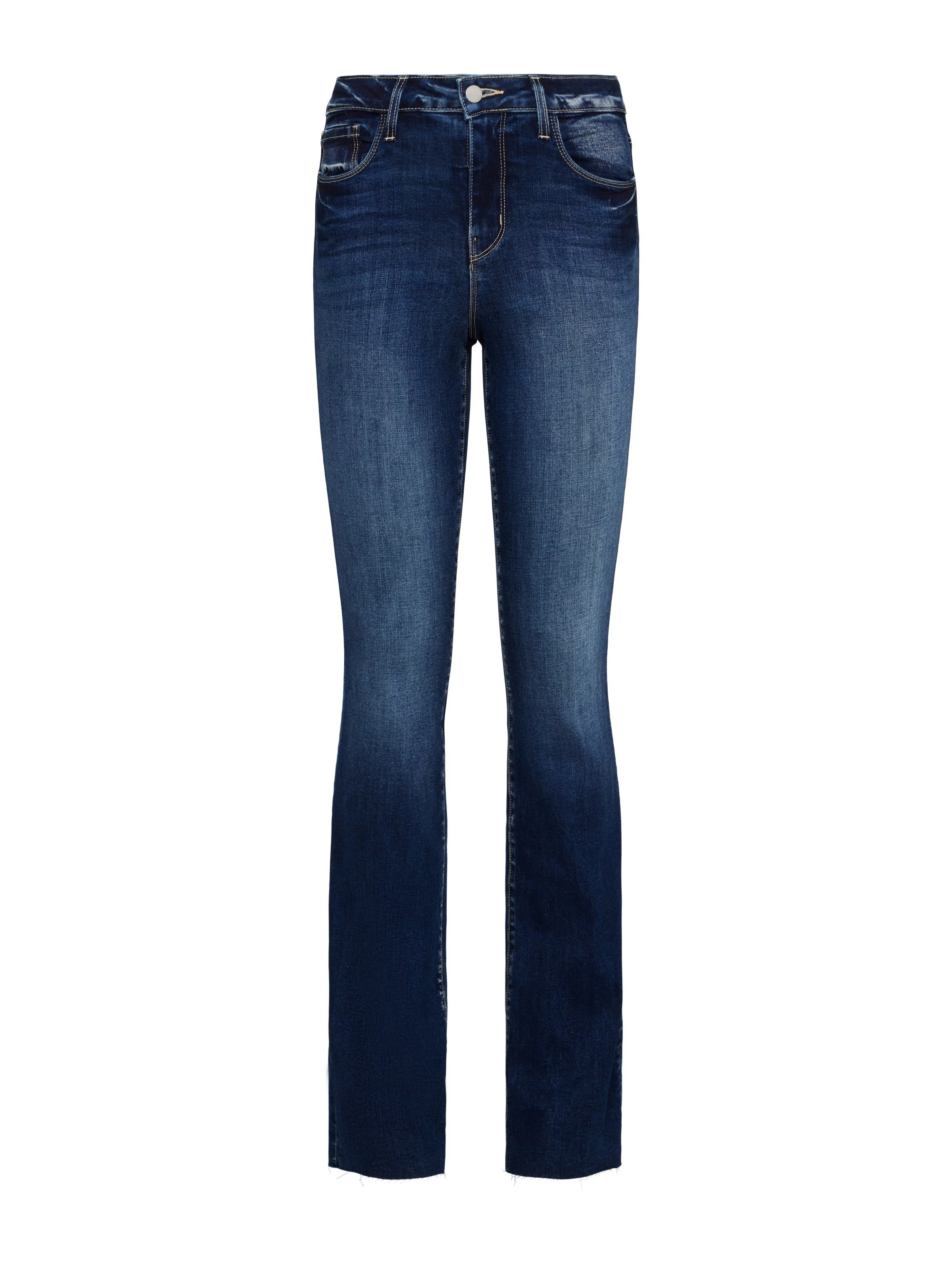A classic high-rise jean in a dark-indigo wash with a vintage hand that creates an authentic vibe. Premium stretch denim includes REPREVE, a sustainable, high-performance recycled fiber. With a flattering contoured waistband, style is fitted through hip and thigh before draping to a straight leg with raw hem. Length can be altered. Contrast topstitching highlights five-pocket construction and front zip fly closure. Style No. 2649PWHR-COLU DETAILS & FIT - Model Details: Height 5’10.5" | Bust 33" | Waist 24" | Hips 34" | Wearing Size 25 - Rise: 9.5" - Inseam: 34" - Leg Opening: 17" MATERIALS & CARE Composition - 73% Cotton 25% Repreve Polyester 2% Spandex - Made in Los Angeles Care - Machine wash