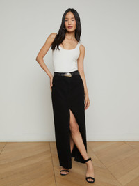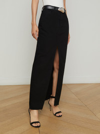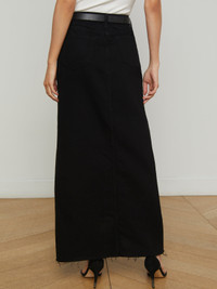 The Rysa denim maxi skirt features a deep front slit for ease of movement—plus a sultry hint of leg. Now in saturated black. • All-cotton denim • 5-pocket design • Raw hem • Zip fly and button closure Style No. 3448KDWR-NOIR DETAILS & FIT - Model Details: Height 5'9" | Bust 30" | Waist 24" | Hips 34" | Wearing Size 25 - About 39" From Waist to Hem MATERIALS & CARE Composition - 100% Cotton - Made in Los Angeles Care - Machine wash