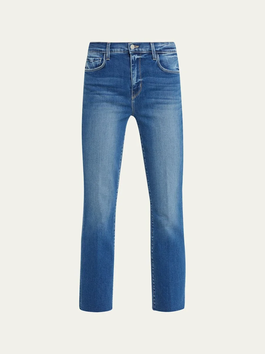 L'Agence "Sada" jeans in light wash denim. Approx. 26" inseam. Five-pocket style. High rise. Straight legs. Cropped above ankles. Frayed raw-edge hem. Button/zip fly; belt loops. Cotton/polyester/polyurethane. Machine wash. Made in USA of imported material. Model is 5'10"/177cm. Online Inquiries: BGS21_T1PUG| Store Inquiries: #3348868