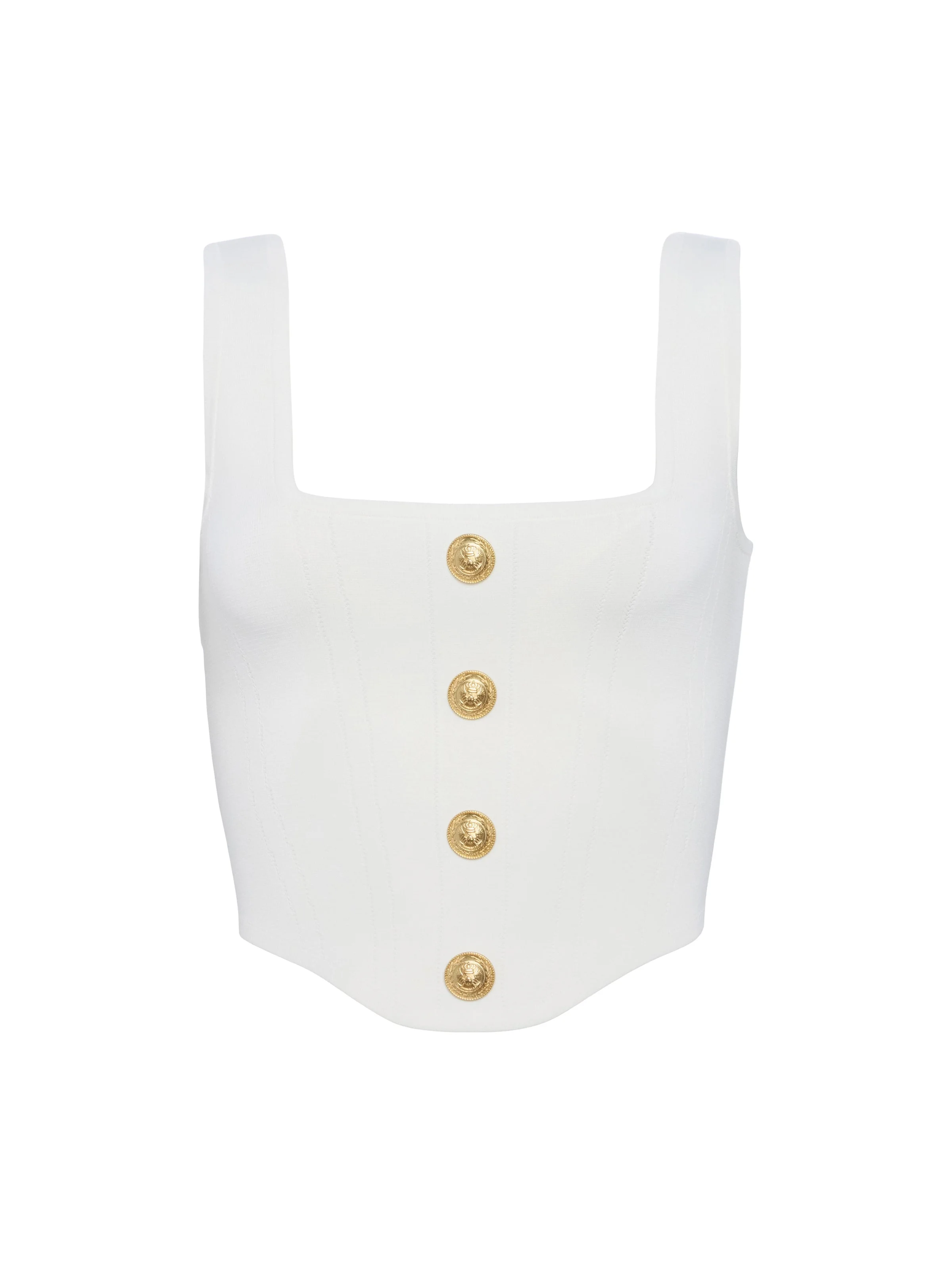 The perfect little ivory top in a power knit that supports and smooths the figure, finished with a curved hemline that flatters and forgives. • Power knit fabric • Square neck • Fitted • Decorative embossed dome buttons Style No. 80010NXC-IVGO DETAILS & FIT - Model Details: Height 5'9" | Bust 32" | Waist 24" | Hips 34" | Wearing Size XS - About 17.5" From Shoulder to Hem MATERIALS & CARE Composition - 60% Rayon 38% Nylon 2% Spandex - Imported