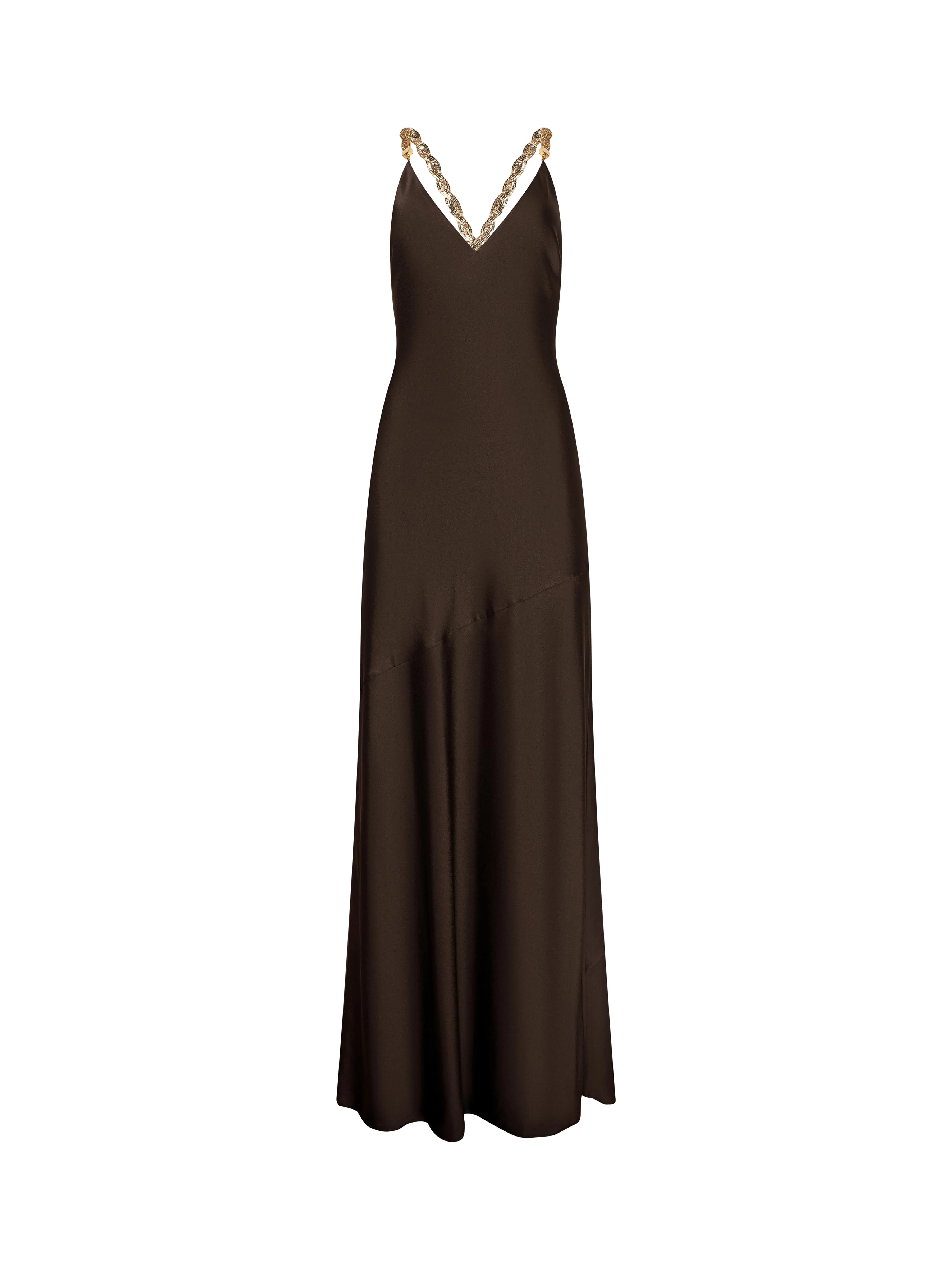 Style No. 61469CES-DKBR DETAILS & FIT - Model Details: Height 5'9" | Bust 30" | Waist 24" | Hips 34" | Wearing Size 2 - About 57.6" From Shoulder to Hem - Chain Length: 17.25" MATERIALS & CARE Composition - 100% Polyester - Imported Care - Dry clean only