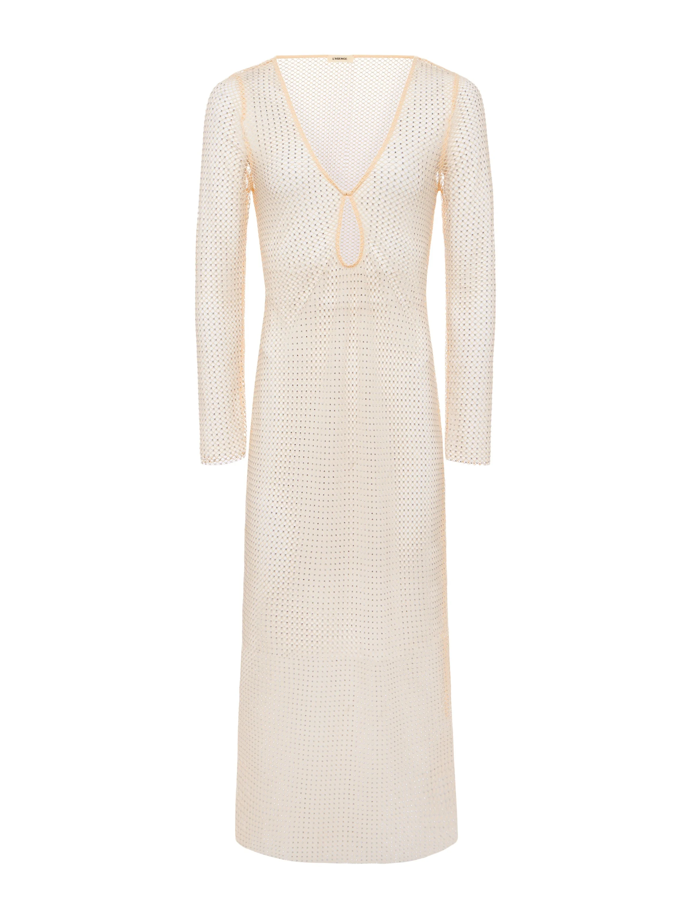 Part dress, part cover-up—either way, you'll want to slip her into your vacation rotation. This mesh maxi dress is designed to showcase your swimsuit. A deep V-neck and keyhole cutout amplify the undeniably sexy vibe, and subtle crystal embellishments adds a glamorous touch. With a liquid hand, she drapes over the figure in a subtle cling. Easy to pack and easy to wear, Sara is the perfect choice for lounging poolside or warm days at the beach. Style No. LG4MC32-CHMP DETAILS & FIT - Model Details: Height 5'10" | Bust 32" | Waist 24" | Hips 34.5" | Wearing Size XS - About 50" From Shoulder to Hem MATERIALS & CARE Composition - 97% Polyester 3% Elastane - Imported Care - Dry clean