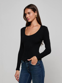Style No. 5837CMR-BLAC DETAILS & FIT - Model Details: Height 5'10" | Bust 32" | Waist 23.5" | Hips 34.5" | Wearing Size XS - About 21" From Shoulder to Hem - Sleeve Length: 23.5" MATERIALS & CARE Composition - 47% Cotton 47% Modal 6% Spandex - Made in Los Angeles Care - Hand wash