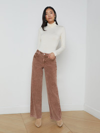 Fitted and flattering through the hips, the Scottie is our classic wide-leg jean. A contoured waistband sits securely at the natural waist without gaping. • Premium stretch corduroy • High-rise wide-leg • 5-pocket design • Front zip-fly closure • 32” inseam Please note that due to the nature of the dyeing process, products may vary slightly in color. Style No. 2859PWC-PLAS DETAILS & FIT - Model Details: Height 5’10" | Bust 34” | Waist 24" | Hips 35” | Wearing Size 25 - Rise: 10" - Inseam: 32" - Leg Opening: 20" MATERIALS & CARE Composition - 97% Cotton 3% Elastane - Made in Los Angeles Care - Machine wash