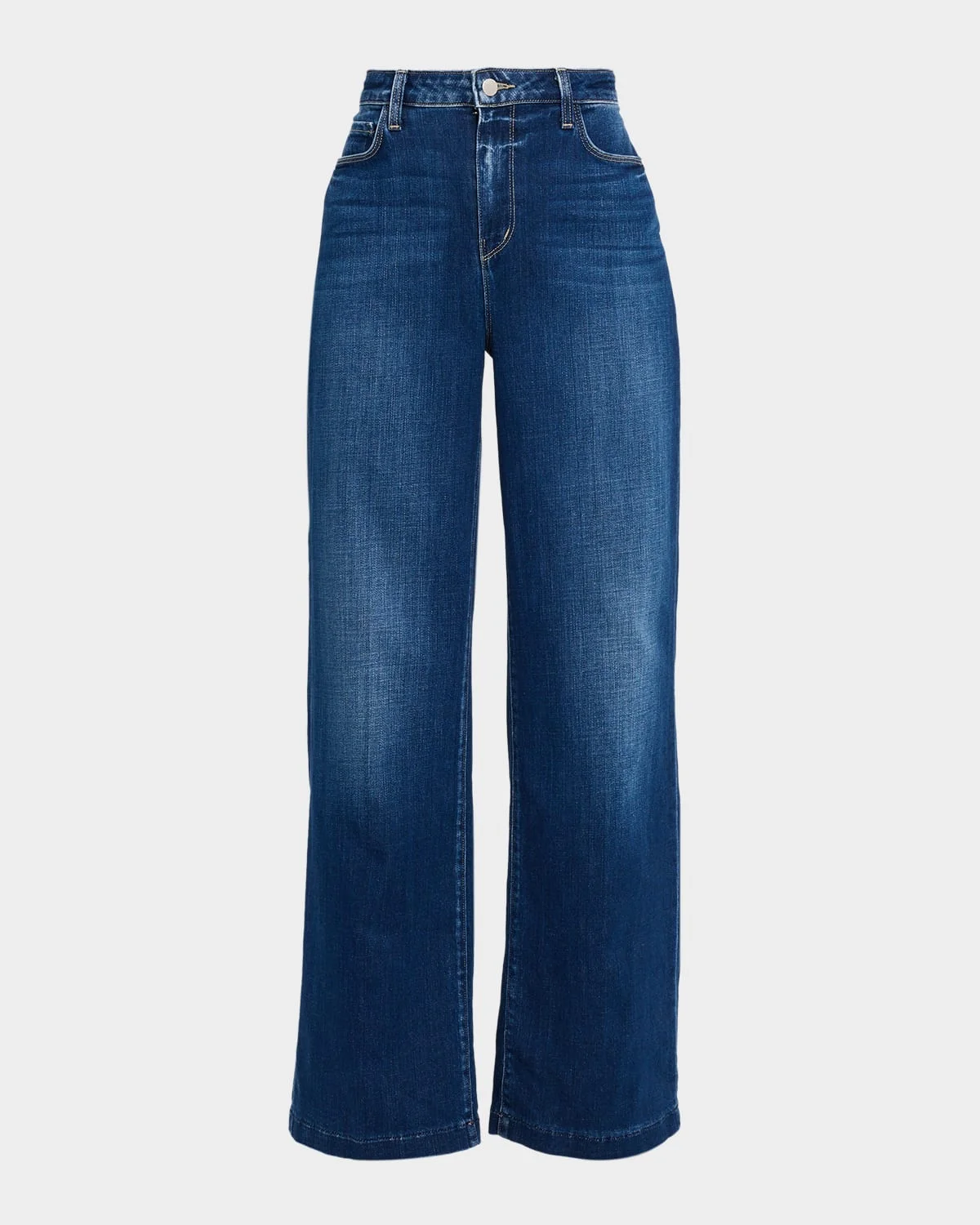 L'Agence "Scottie" sleek wideleg jeans in faded stretch denim Approx. 10" rise; 32" inseam High rise Fivepocket style Waisthugging fit Full length Button/zip fly; belt loops Cotton/polyester/Lycra xfit® spandex Machine wash inside out Made in USA